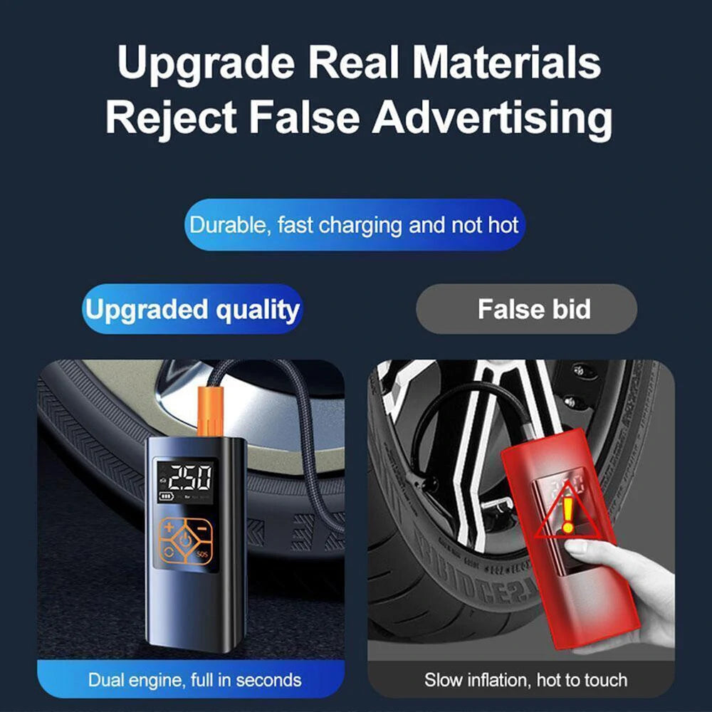 3. Compact and portable design for convenience: Our tire air pump has a compact and portable design for easy portability and storage. The size is 17*7*5cm, it can fit into your trunk or glove box without taking up too much space. This feature makes our products a handy tool to have close at hand for emergencies or scheduled maintenance.