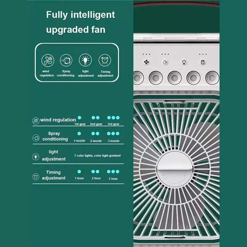 Features:[ All Year Round 4-IN-1 Portable Air Conditioners ] - The air cooler features a multifunctional design, which can be used as fan, portable air conditioner, humidifier, and night light. We have improved this personal air conditioner to make it smaller and more powerful. Cooling you in hot summer and humidifying the air in dry autumn and winter, it is also used for aromatherapy on weekdays.[ Efficient Cooling & Automatic Timing ] - 3 wind speeds (high, medium, low) can be adjusted, manually up-down to adjust the blowing direction within 360° to meet your different needs. Depending on the 3 spray speeds (1/3/5 humidifier misting hole) you choose, a full 600ml tank of water can continuously keep spraying for 2.5-12 hours. In addition, you can choose the most suitable auto timings (1/2/3h) to enjoy your leisure time, sleeping, or working time.[ Energy Saving & Low Noise ] - The desktop air cooler has 7 soft LED colors and 1 fade choice in all to create a romantic atmosphere! Misting air fan can work powerfully at a low noise level, letting you enjoy a comfortable sleep all night at a suitable temperature. Besides, the portable air fan operates at low energy consumption, much cheaper than running a freon air conditioner. So you should not expect the same results as an air conditioner. Please put it beside you not over than 3ft-4ft.[ Unique Design & Easy To Use ] - We have improved this air conditioner portable to make it simple to set up and use. Simply connect the USB cable to the devices that support the USB port. The removable design helps you more easily clean your water tank and add water& ice cube to the water container. Portable handle, you can easily carry it out, very suitable for indoors and outdoors.[ Enjoy Cooling Summer Time Anywhere ] - The size of this USB mini air conditioner is 10.75*8.5*4 inches and weighs only 1.88 pounds, easy to carry. The small air conditioner can be used in combination with adapters, mobile power supplies, computers, car chargers, etc. Use it in your home or work office, dorm room, or travel wherever you need it.Note: The output current of power supply equipment shall be greater than or equal to 2A, otherwise, the product will not work normally due to insufficient power supply.Specifications:Function: Fan / Humidify / Air Cooler / Night LightWind Speed: 3 Speeds - Low / Mid / HighColor: Black, White, Green