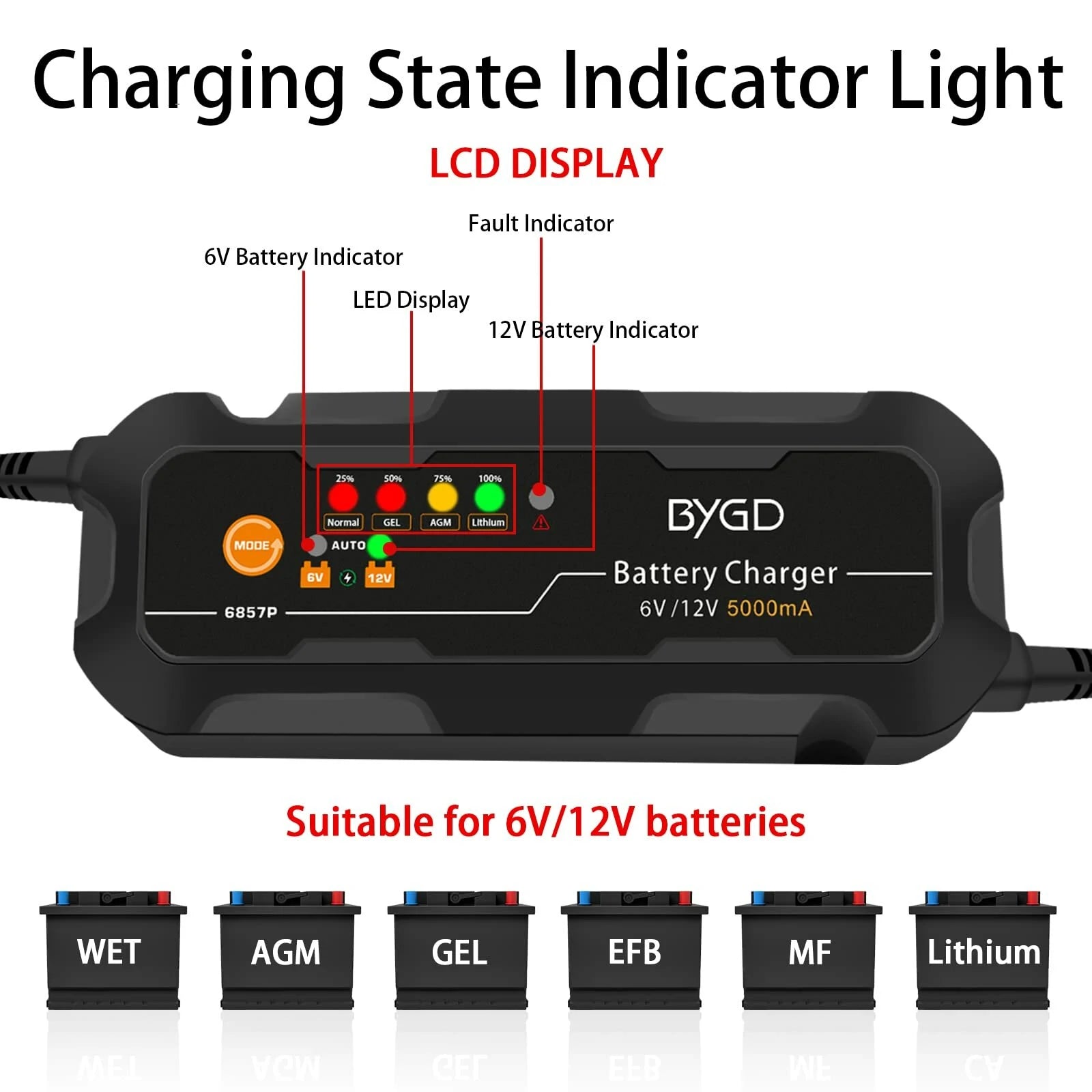 3.This battery charger is compatible with 6V and 12V WET, GEL, Li-ion and AGM batteries.