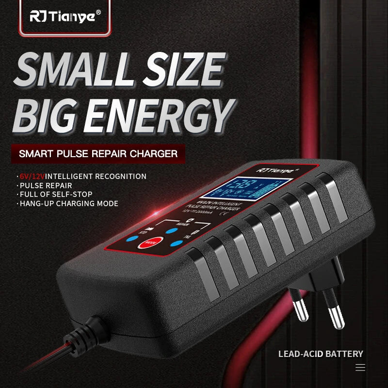 RJtianye Smart Automatic Motorcycle Battery Charger with 2m Clamp for 6V-12V 2Ah-20Ah Lead-Acid Battery