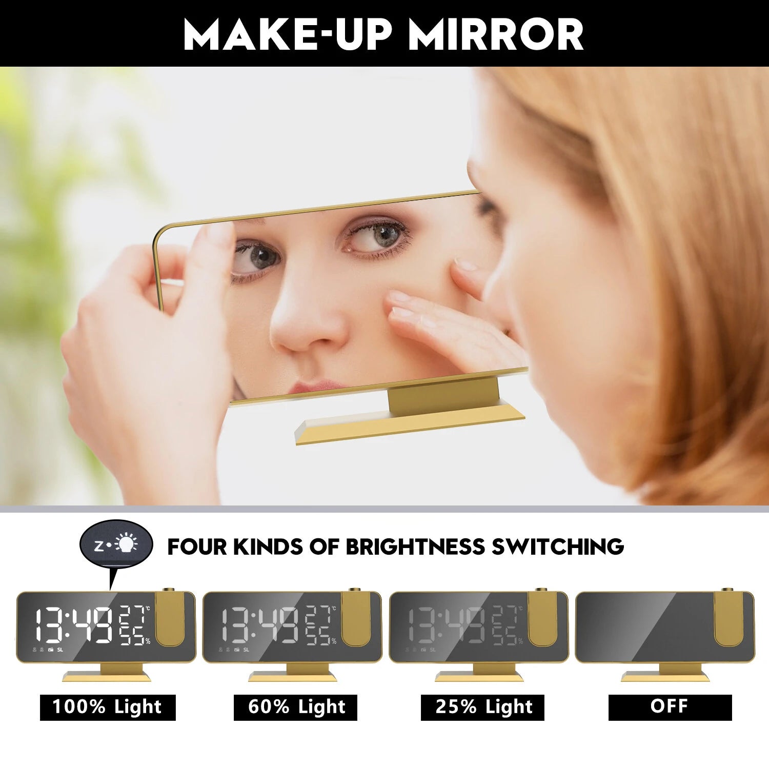 Large LEDs digital display: time, humidity and temperature can be easy to reading.Projection function: project time, adjustable focus, 3-level projection brightness, can rotate the projection 180°.Automatically light-adjusting:in this mode,the projection brightness can't adjust automatically according to inddor brightness.FM radio function: manual FM, the listenning time can be set, automatic search station.Dual alarm clock function: 2 alarm clocks can be set to any time separately, also set snooze mode.Indoor thermometer function: real-time temperature display, 12H/24H modes.4 levels of display brightness can be manually adjusted as you need.The screen is special progressed which can be used as a makeup mirror.Built-in powers off memory function.Specifications: