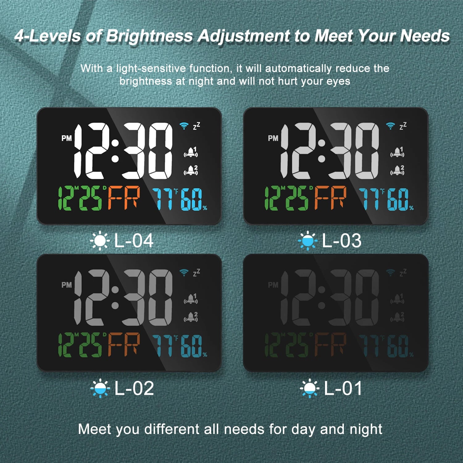 1.【Wifi Connection & Auto Update】Adjust time automatically with no need to manual setting.2.【App Alert】Intelligent reminder & temperature and humidity detection help you protect home. The clock works with Smart Life Application allowing you view historical data.3.【4 Levels Automatic Brightness Dimmer】With 4-level adjustable brightness display, you can easily adjust to a comfortable brightness manually by using the remote control. The LED clock has a built-in automatic dimming sensor, which can also automatically adjust the brightness as the light changes, smart to provide you with the needs. 4.【Memory Function】There is a built-in memory function, even if the power is disconnected, the time data will not be lost, no need to reset.5.【Beautiful and Functional】This wall clocks is suitable for living room, kitchen, garage, farmhouse, office, warehouse, classroom, gym, shop, nursery. And it is also the best gift for friends, partner and the elderly.