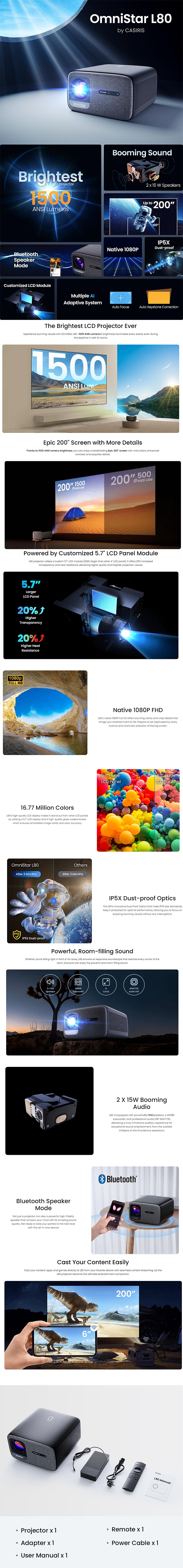 1. High Brightness and Resolution: The CASIRIS OmniStar L80 offers a bright and clear projection with 1500 ANSI Lumens and native 1080P FHD resolution, with support for 4K decoding for stunning visuals.2. Immersive Sound: Enjoy a rich audio experience with dual 15W stereo box sound speakers that enhance your home theater experience.