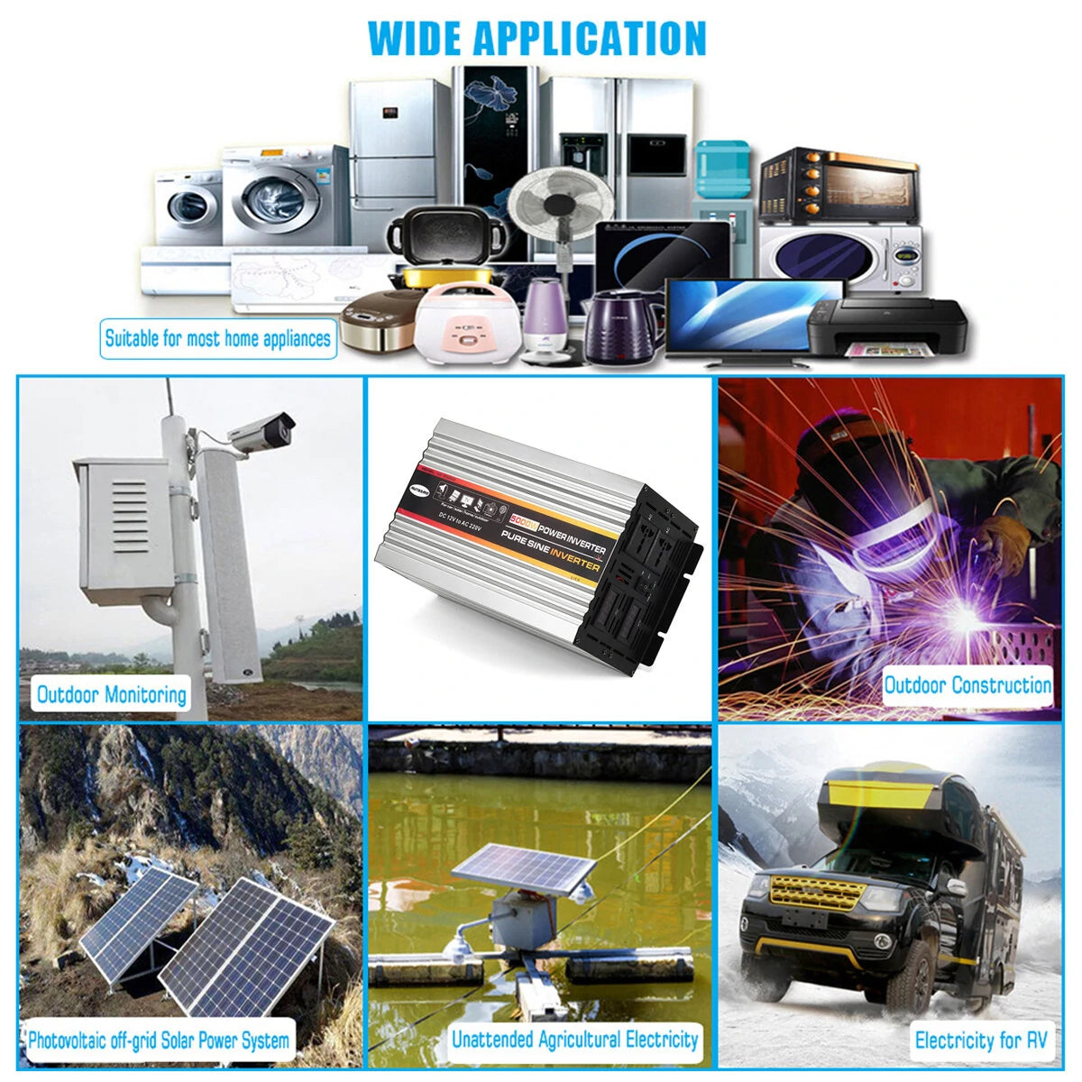 4.High Conversion Efficiency: This inverter provides efficient power conversion from 12V DC to 220V AC with a pure sine wave output. It ensures your devices run smoothly and efficiently, even those requiring a more sensitive, cleaner power source.