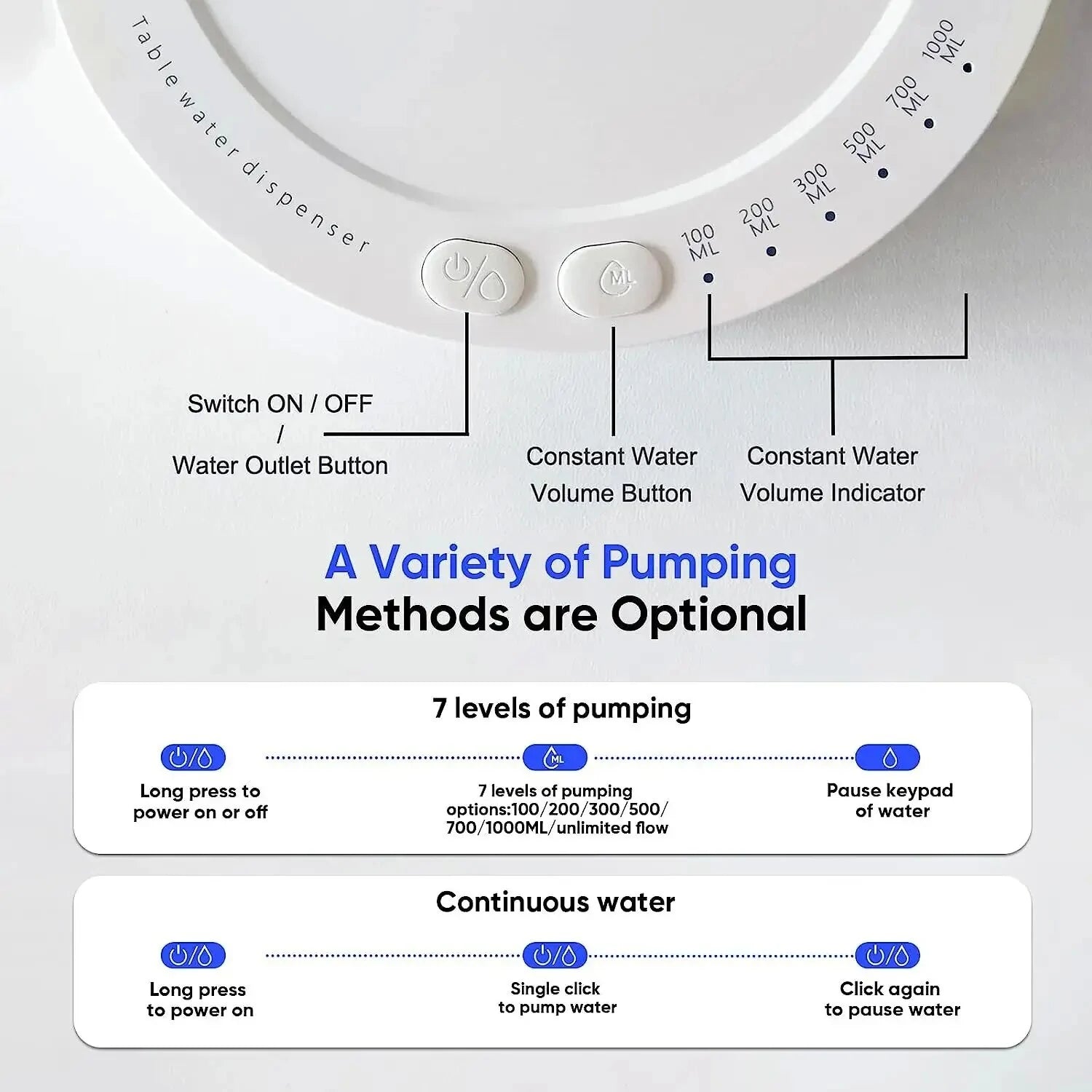 Features:• Automatic Dispensing :The dispenser automatically dispenses water without the need for manual pumping, making it convenient and easy to use.• USB Charging :The dispenser can be charged via USB, making it easy to charge anywhere and anytime.• 7 Levels of Dispensing :The dispenser has 7 levels of dispensing, allowing you to dispense the exact amount of water you need.• Universal Bottle Compatibility :The dispenser is compatible with 5 gallon and universal bottles, making it versatile and suitable for different types of bottles.Quantitative Pumping with 7 Levels: Water dispenser has 7 water outlet options, including 100ml, 200ml, 300ml, 500ml, 700ml, 1000ml and unlimited water volume mode. Button of smart water dispenser can select required water volume. Water desk dispenser can meet different drinking water needs. Continuous pumping function of water dispenser can satisfy lots of water users, allowing users to quickly draw water. In different scenes water dispensers can provide convenient drinking water service.Premium materials for health: Shell of desktop water dispenser is made of ABS plastic, the outlet of smart water dispenser is made of 304 stainless steel. Bedside water dispenser is equipped with a 3.9-foot food-grade silicone hose. Desktop water dispenser comes with a dust plug and filter element. Dust plug of desk top water dispensers can prevent dust from. Filter elements of desk top water dispensers can remove odors. Electric water dispenser provides a healthy drinking water way.Super Long Battery Life: Desktop smart water dispenser has a built-in 1800mAh USB rechargeable battery. Water dispensers can draw about 100L of water in a fully charged state is equivalent to about 5 bottles of 5 gallons of water. Desktop water dispenser adopts an energy-saving design can prolong service life of water dispenser battery. Fast charging is advantages of table water dispenser, only takes 2-3 hours to fully charge water dispenser. Water dispenser can be charged by power bank or other.Practical and Convenient Design: Desktop water dispenser is small and detachable. Portable water dispenser is easy to install, just align with the groove and rotate to fix it. Suction tube of water dispenser can be put into different capacities water bottles, and base of water dispenser can hold a water cup up to 7 inches. Low-noise function of water dispenser is convenient for use in various occasions. Enjoy refreshing water without lifting bulky water bottles with desktop water dispenser.For Indoor & Outdoor: Smart table water dispenser comes with 1 water hose, 1 USB charger cable, 1 user manual. Water desk dispenser's compact size and light weight make it ideal for camping, party, homes, and more. Desktop water dispenser has characteristics of intelligent control of water volume and low noise. Matching bucket dust lid protect drinking water from pollution, is perrty practical.Desktop Water Bottle Dispenser SpecificationInterface: TYPE-CBattery capacity: 1800mAhCharging Time: 2-3 HoursRated current: 0.8ARated voltage: 5VRated power: 4WMaterial: ABSProduct size: 120x137x225mmColor box size: 242*150*65mmProduct net weight/gross weight: 265g/415gPackage List1Pcs * Desktop Water Bottle Dispenser1Pcs* Food Grade Silicone Hose1Pcs* USB Charging CableWarm Tips:1.Please place the water bottle lower than this 5 gallon water jug dispenser, keep the pump hose inserted in the water.2.Remember to use a 5V charging head to charge it.