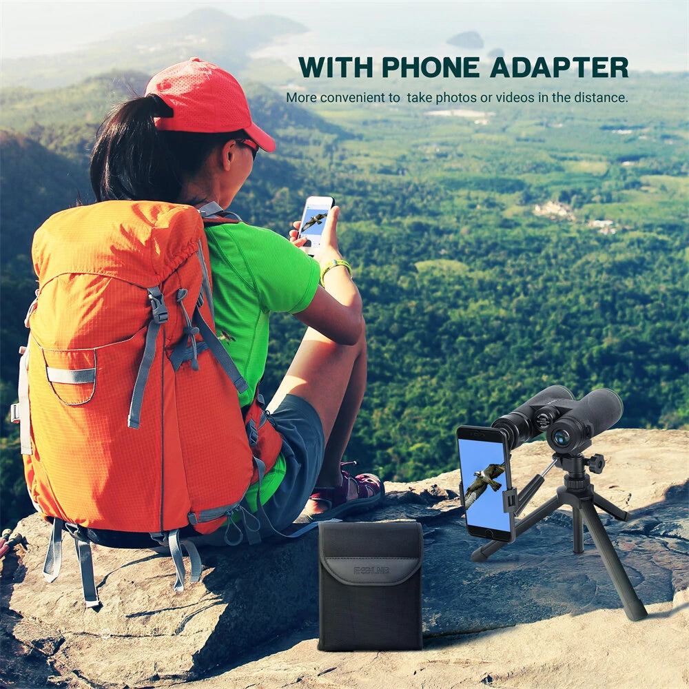 5.Roof prism binoculars with phone adapter is easy to set up and take videos or photos in the distant world. 1/4'-20 threads on the front, you can connect it to a tripod with a binocular adapter. Shock-absorbing rubber armor prevents moisture, dust and debris from entering the binoculars,as well as a a firm grip. 12X binoculars with bag and strap, it’s easy to carry and perfect for outdoor activities such as climbing, hiking,and watching scenery.