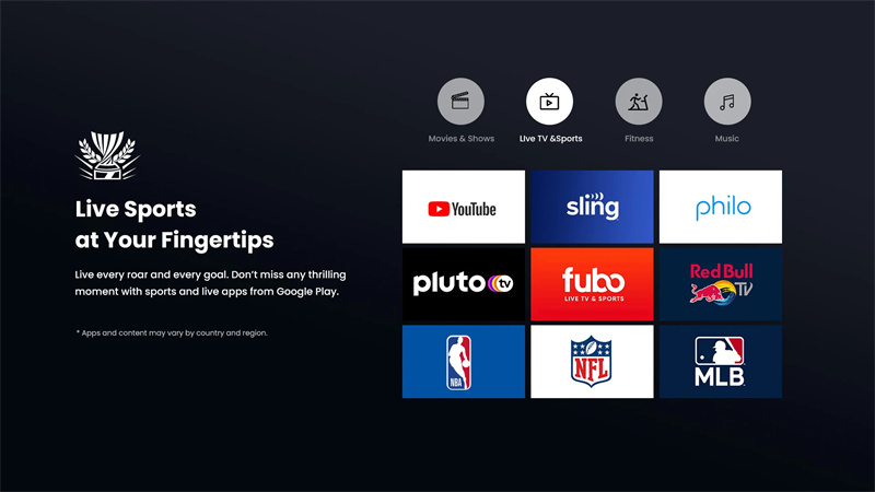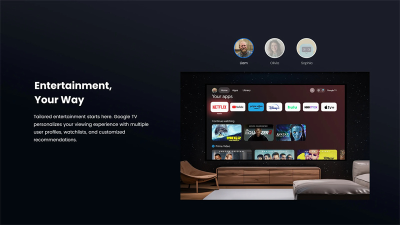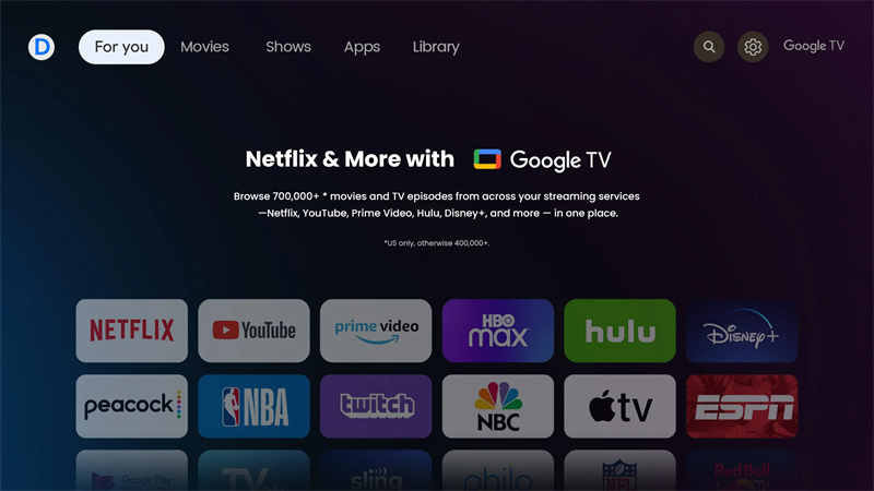 3. Allows unrestricted access to 10,000+ applications with the embedded Google TV, including YouTube, Primme Video, Hulu, and Disney+.