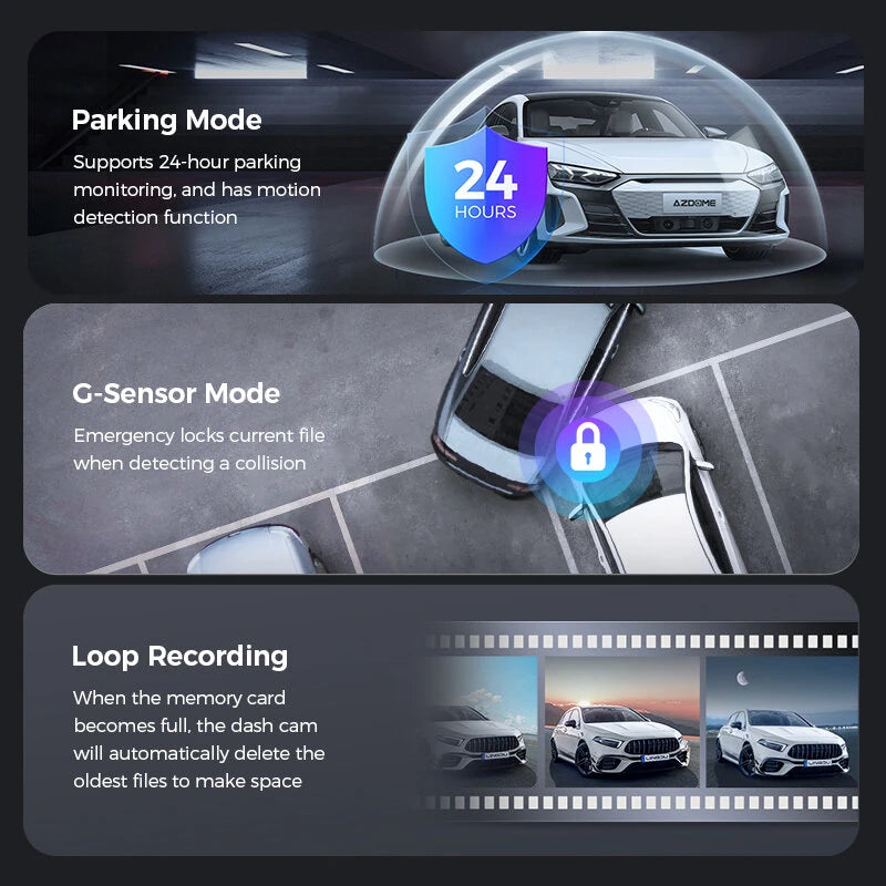 5. Loop recording: The dashcam will automatically overwrite the oldest footage when the memory card is full, ensuring continuous recording.