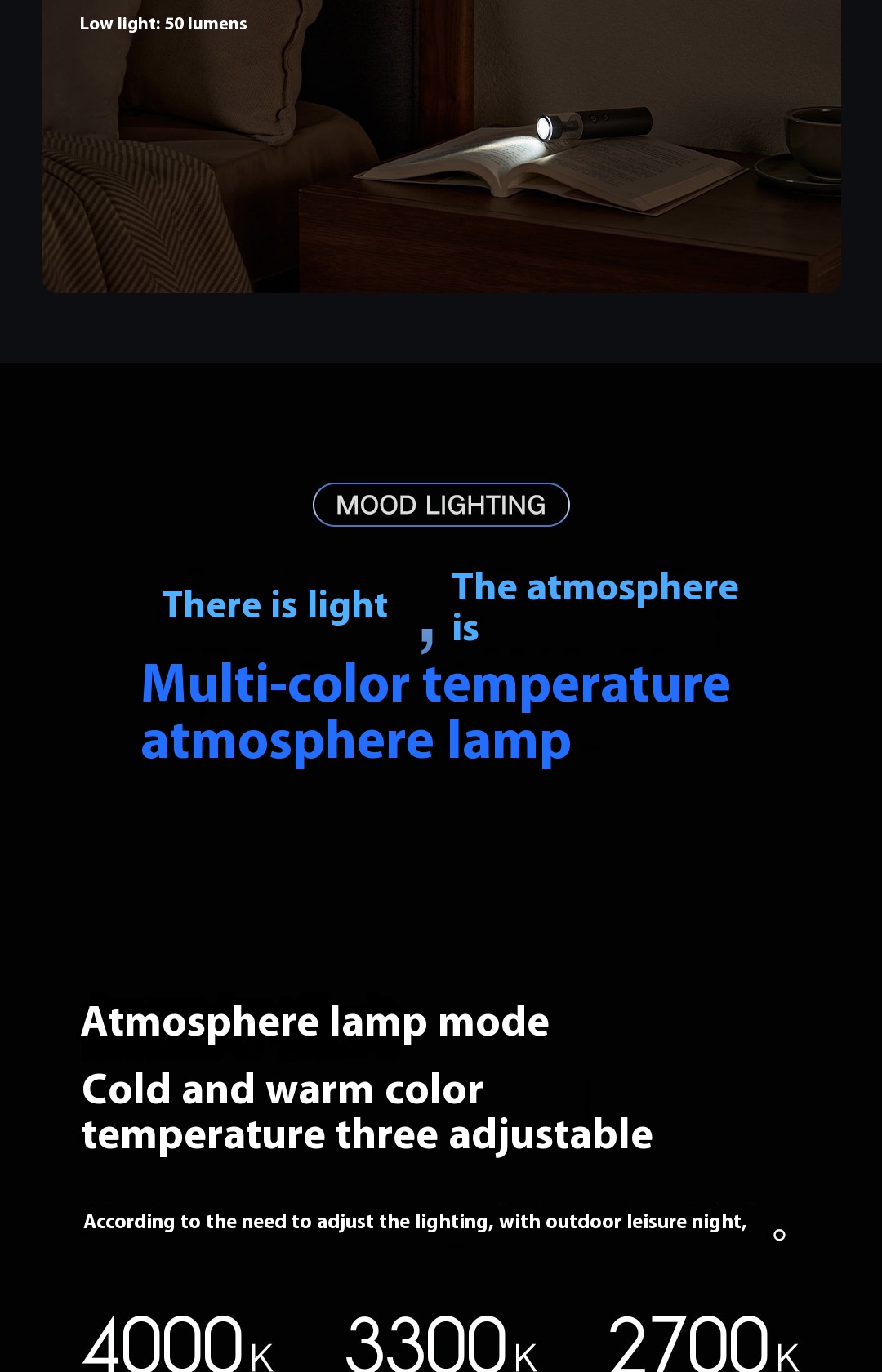 easy to hold, portable without burden.6. There is light and atmosphere. Multicolor temperature ambience light. Ambience light mode: Cold and warm color temperature the third gear adjustable.