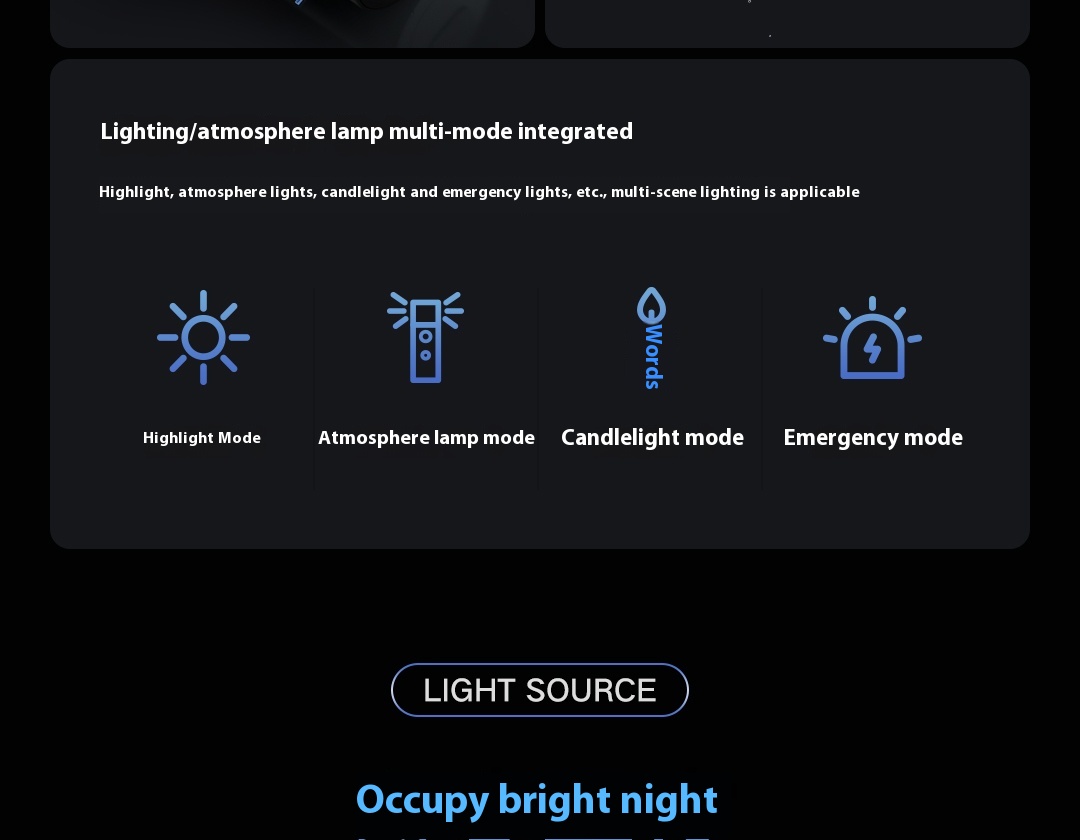 Mode buttona. Press and hold the “power button” to turn on the light, then tap the 'mode button' to select the main light, ambient light or candlelamp mode.b. After selecting the main light or ambient light, tap the 'power button' to switch their brightness.c. Long press 'mode button' for 3 seconds to turn on the Strobe mode. Click the 'mode button' again to switch between SOS mode and Strobe mode.