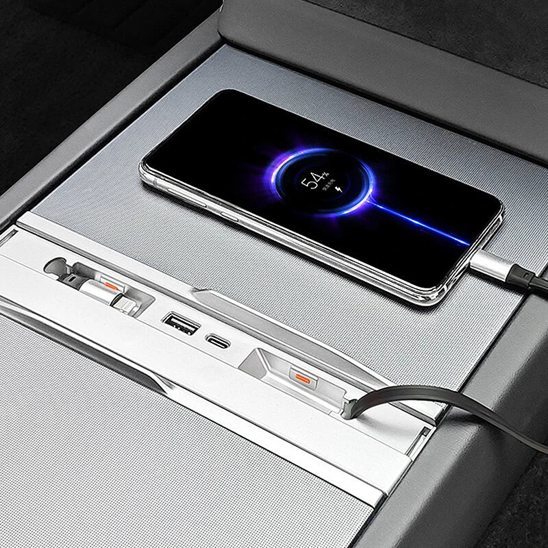 1. 4-in-1 Expansion: Expand your Tesla Model 3 Highland's charging capabilities with 4 simultaneous charging ports, including USB-A, Type-C, and dual retractable cables.
