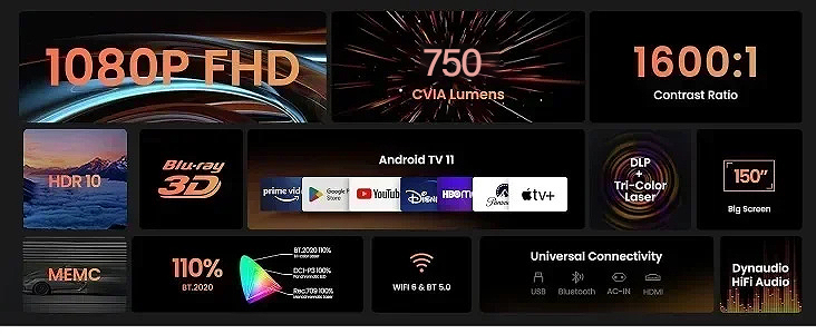 1. Three-Color Laser Optics: Offers immersive cinematic experiences day and night, even in daylight, thanks to superior brightness and 1080P Full HD quality.