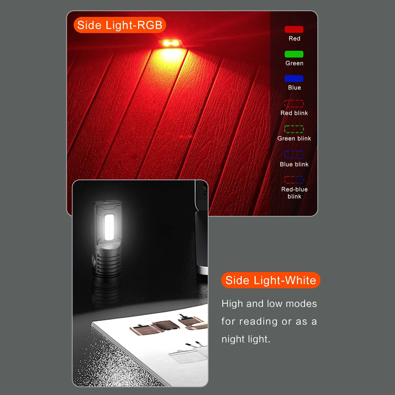 5.Side Light: Two clicks of the switch from off to enter the side white High mode, one click to change the side light modes, two clicks to turn the lamp off.