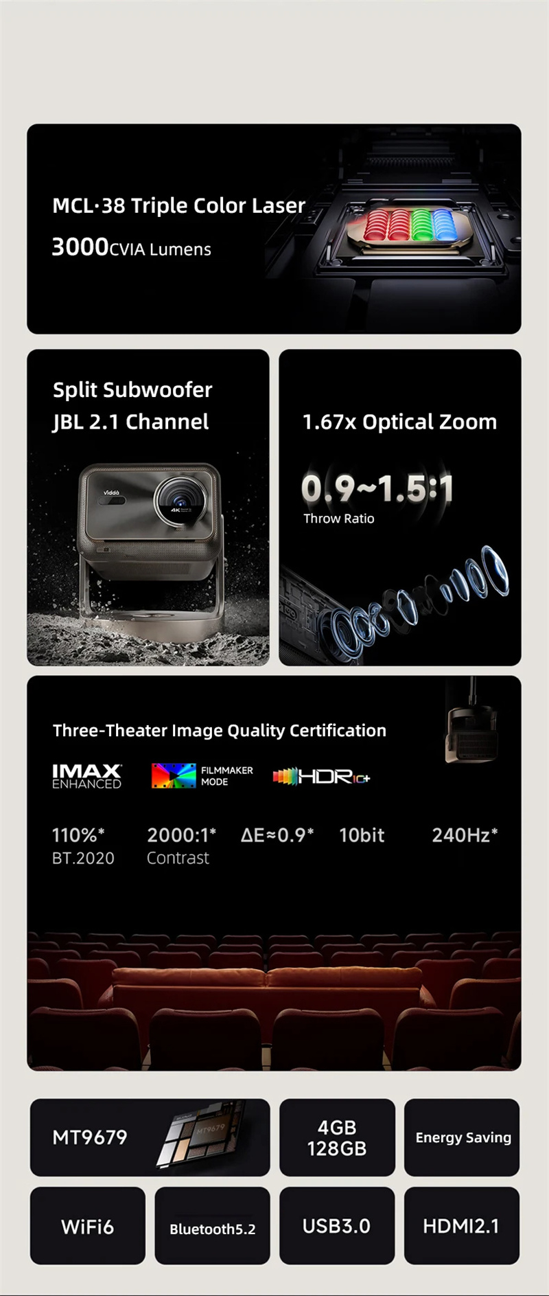[EU/BR Direct English Version] Hisense Vidda C2 Ultra RGB Triple Color Lase 4K Projector 4G+128G HDR10+ Video 3D Beamer 3000 CVIA Lumens Optical Zoom 2.1 Channel Wi-Fi6 BT5.2 Home Theater with Subwoofer Video Player Cinema With Free Gift Television Stick