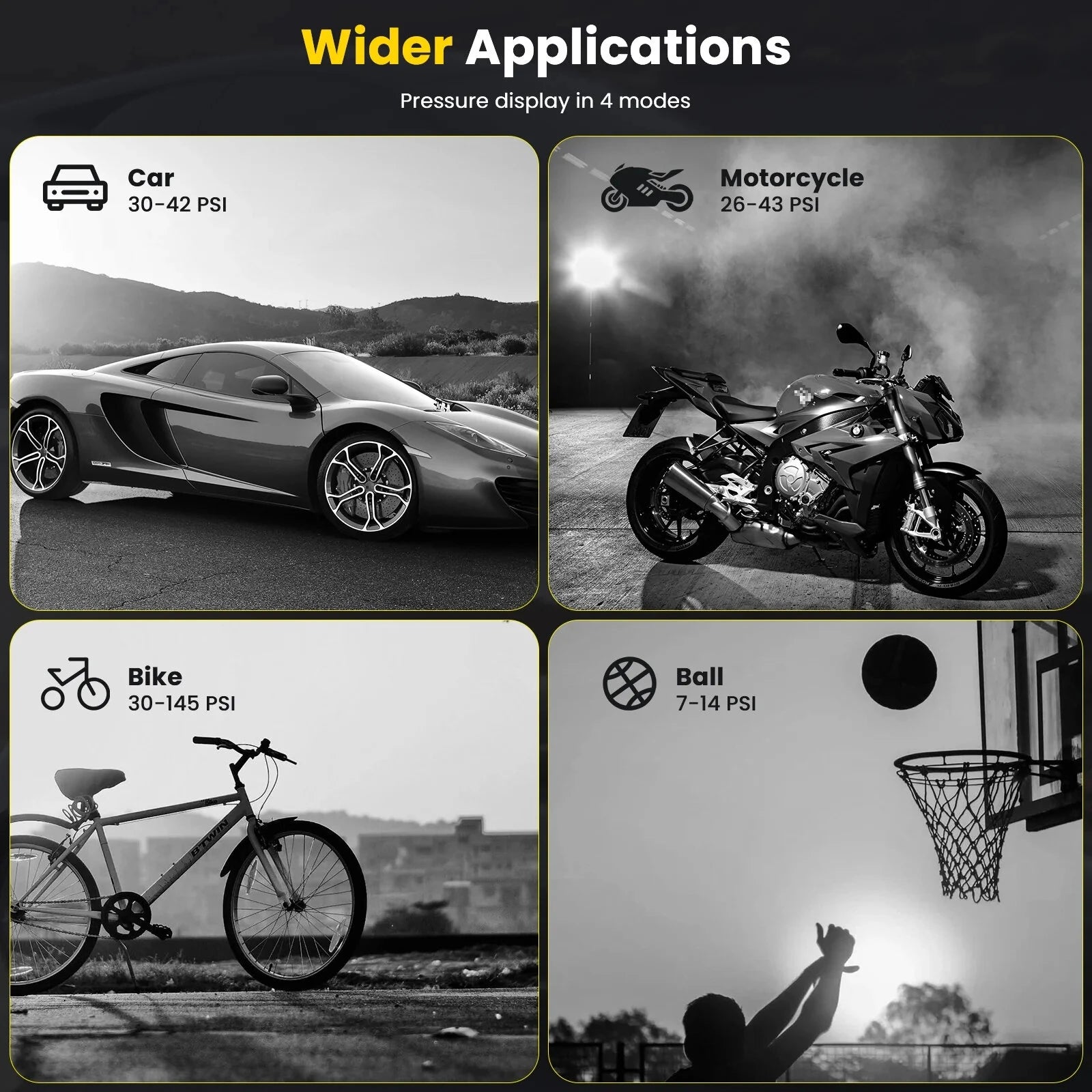 Recommended Uses: Car, Motorcycle, Bike, Bicycle, Ball, Air Mattress, Tire Inflation