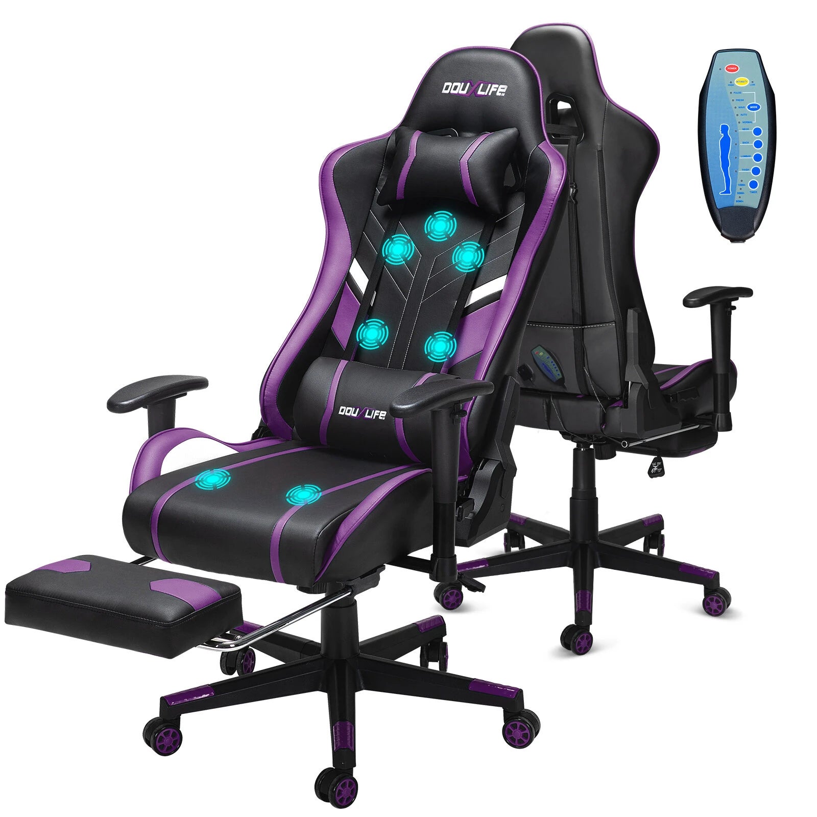 [Ergonomic design for sedentary lifestyle] The Douxlife gaming chair is equipped with a removable headrest and lumbar cushion, maximising adaptation to your back curve. The 33 inch high back design provides extra comfort, the 2D armrests can be adjusted up and down and rotated left and right to optimally accommodate your arms. The ergonomic gaming chair helps maintain a healthy posture during racing games[175° adjustable chair for easy reclining] Office chair equipped with an extendable and thickened footrest, backrest can be adjusted at any angle between 90° and 175°, allowing almost to reach a flat position to find perfect angle for playing or relaxing. With the height adjustment of 0-10 cm, it can be adjusted to your preferred height. Gaming chair is the ideal choice for adults, women or children to work, play, learn and rest[High-quality materials for durability and comfort] The seat cushion of the racing chair is made of high-quality PU leather fabric, which is comfortable to the touch, has good elasticity and has a long service life. The leather is easy to clean. Simply wipe it gently with a towel[Brand new upgrade for sturdy and durabl] Newly improved reinforced foot pads make the seat more stable. Gaming chair consists of a solid iron frame, a thickened explosion-proof chassis and a four-stage air pressure bar, which can provide a stronger load capacity with a maximum load capacity of up to 180 kg. The high-strength five-star nylon base ensures higher stability, safety. The quiet universal wheels can protect the floor and rotate flexibly[Extended coverage and adjustment] The 7-point massage function provides different intensities and modes to choose from, allowing users to customize their massage experience to suit their needs. It covers the lower back, upper back, shoulders and thighs and provides comprehensive relaxation of different muscle groups. The ma