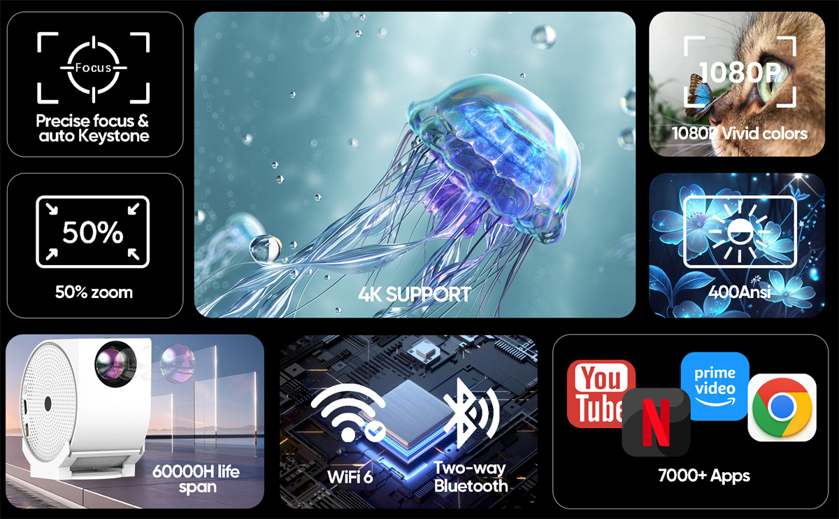 1. Android TV Integration: Combines traditional projection with Android 11 TV box functionality, offering access to 7000+ apps including YouTube, PrimeVideo, Netflix, and Chrome.