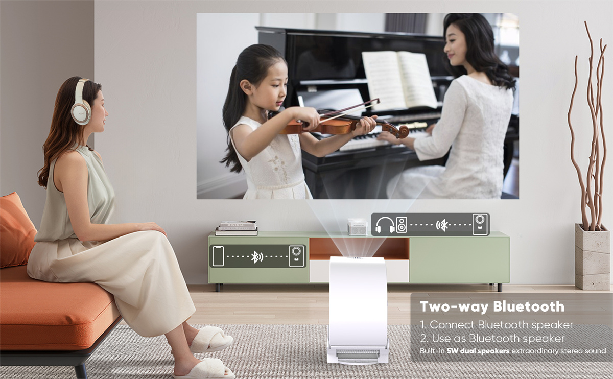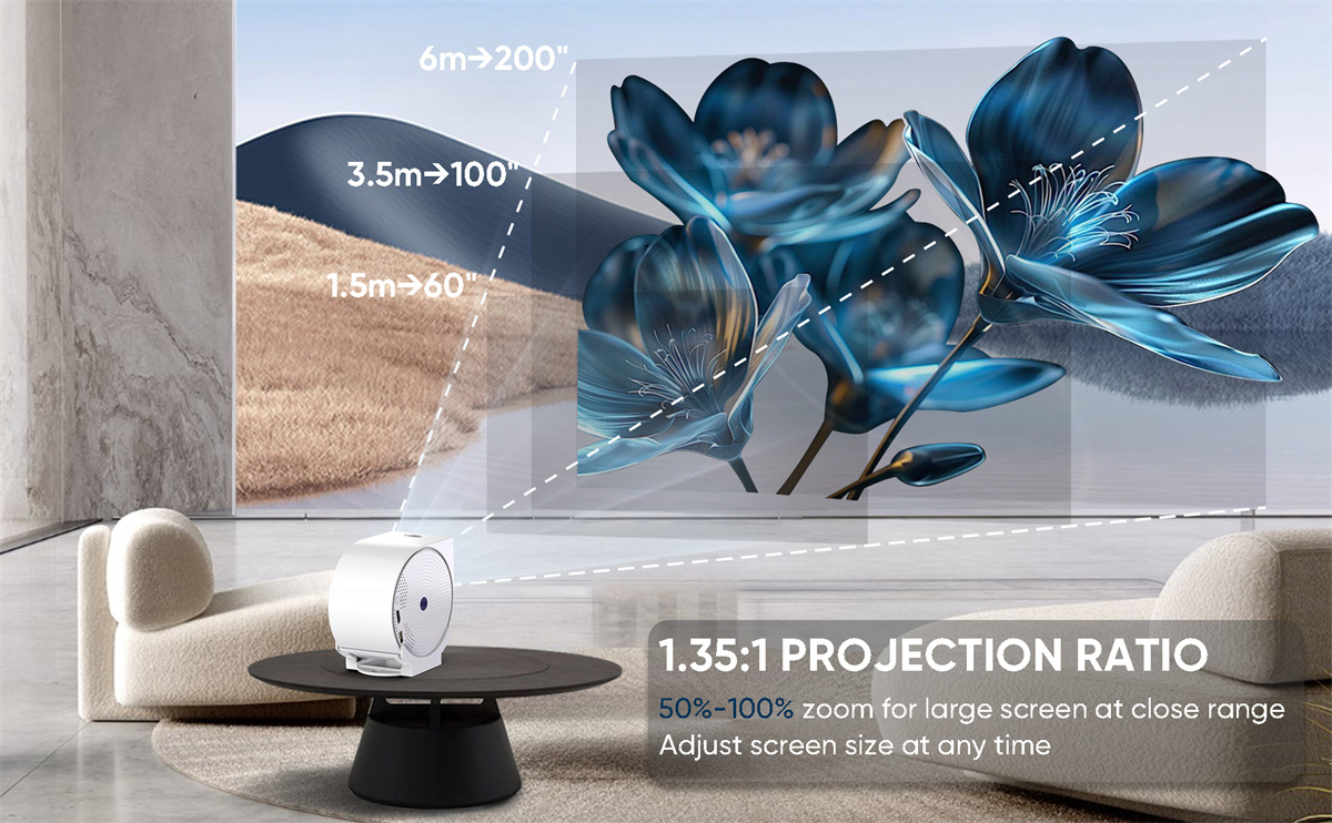 5. Flexible Projection and Screen Size: 270° rotation enables versatile placement, and 50%-100% zoom helps adjust screen size at close range.