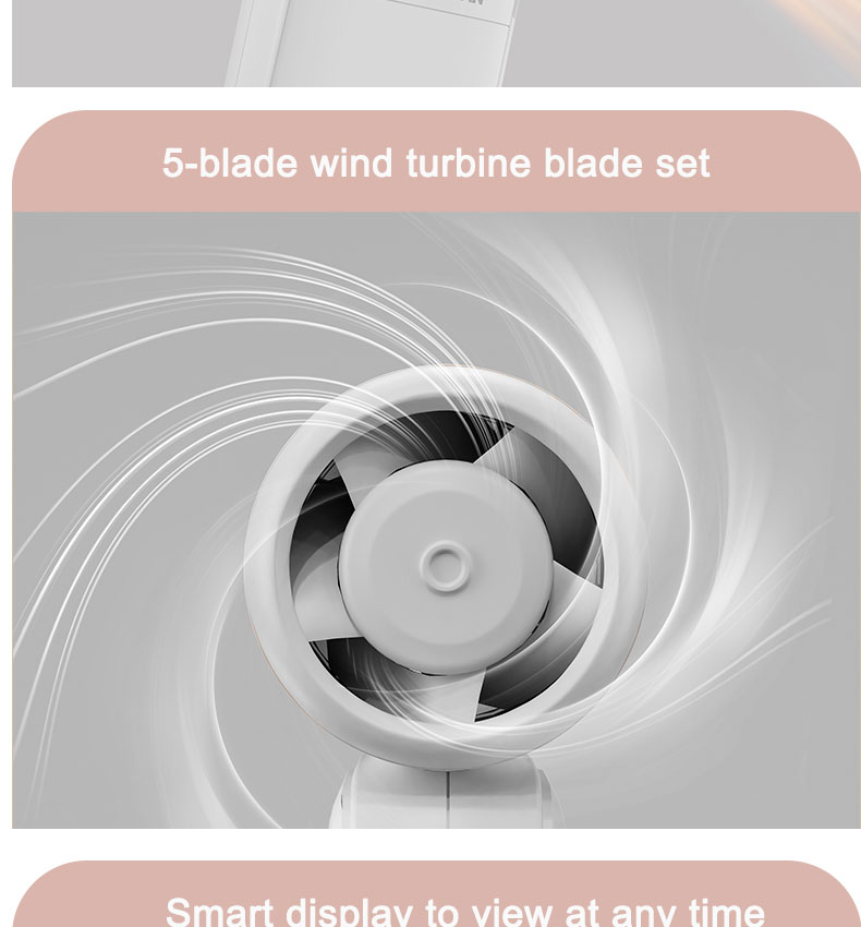 - 5-Blade Wind Turbine: Featuring a 5-blade wind turbine blade set, this fan delivers a powerful and smooth airflow. The innovative blade design ensures cool and comfortable air, tailored to provide a relaxing experience.