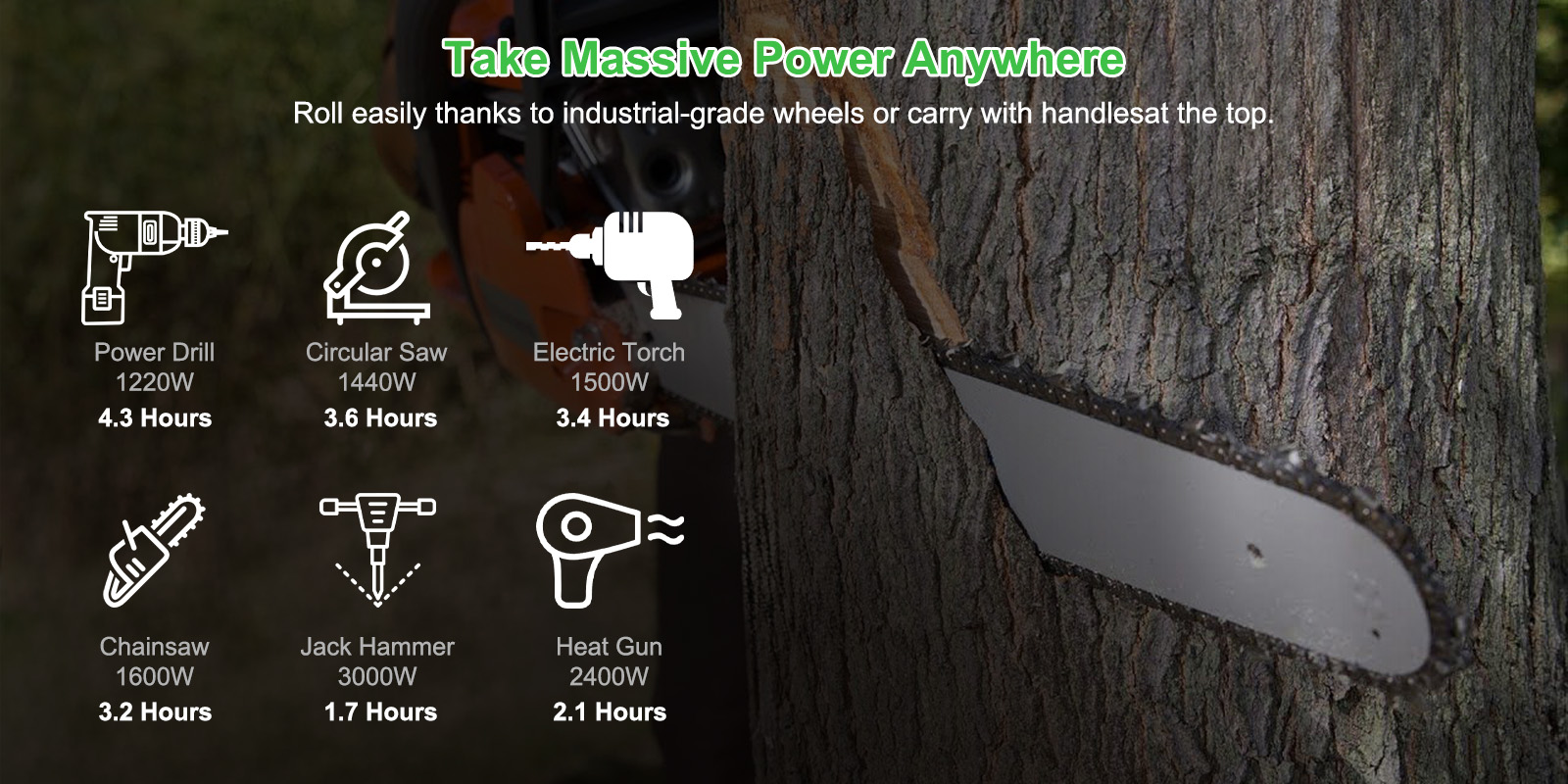 The suitcase-style structure comes with wheels, allowing users to move the unit effortlessly. Multi-purpose AC outlets make it easy to connect various appliances in diverse settings.