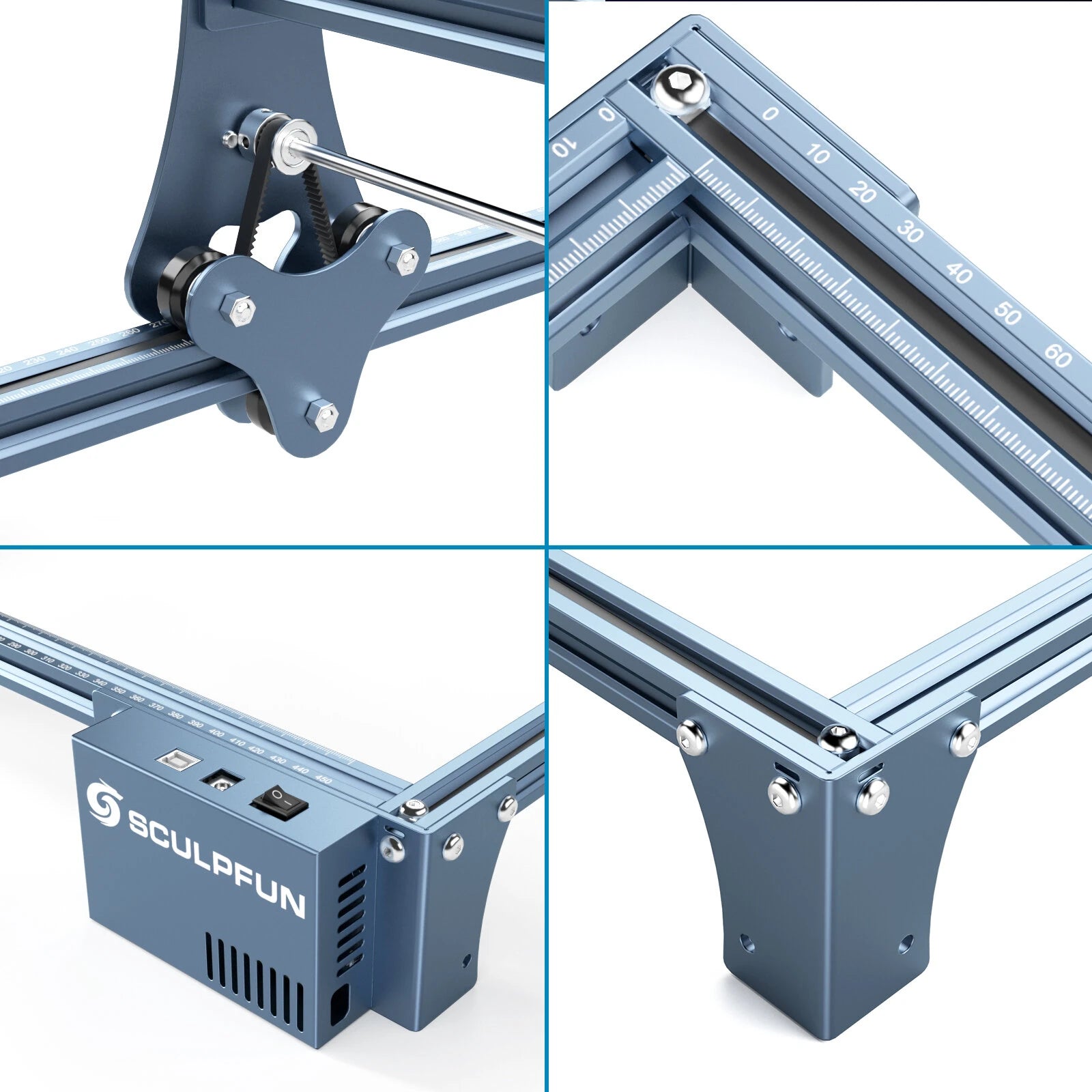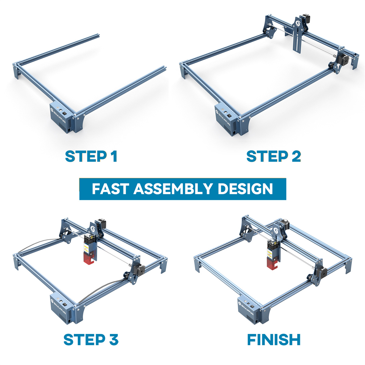 3. Solid and Easy-assembly Structure Design: Full-metal structure design enhances the solidity of the machine, significantly improving the accuracy of engraving. The whole structure is designed for easy-assembly, which can be completed in 10-20 minutes. The structural frame is very long-lasting and remains open to upgrade. During use, you can keep the frame and replace it with other new lasers, or replace longer metal beams to expand the engraving area.