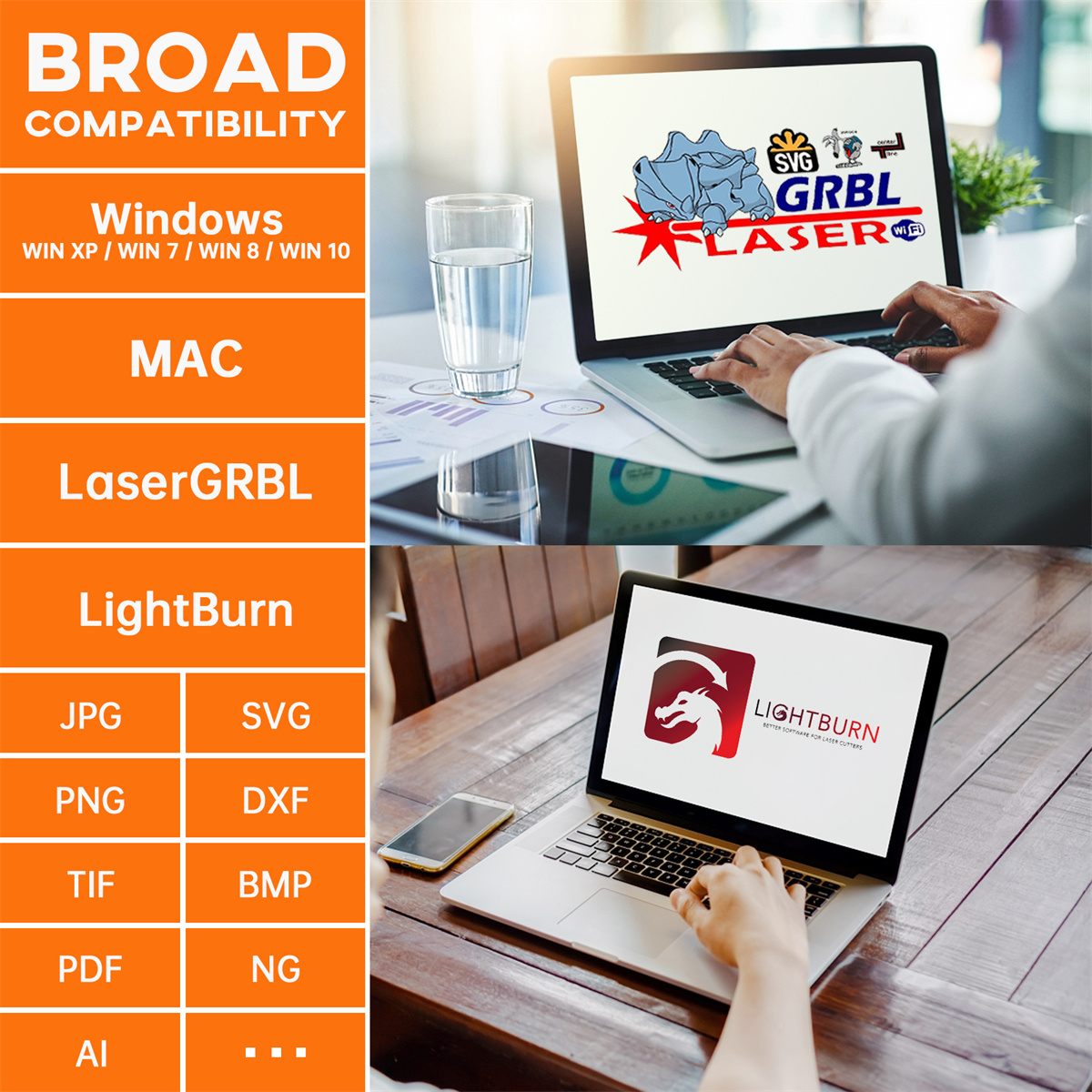 Operating software: LaserGRBL, LightBurn, Benbox, GrblController, LiteFires, support Windows system, support for MAC system. Supported file formats NC, BMP, JPG, PNG, DXF and other image formats.