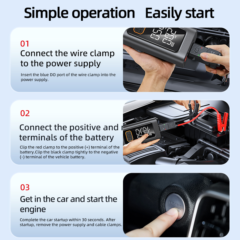 【Complete Safety & Smart Protection】 Designed with user safety as a priority. Includes smart jumper clamps with reverse polarity protection, spark-proof technology, and built-in safeguards against over-current, over-voltage, and overheating to ensure complete peace of mind during use.