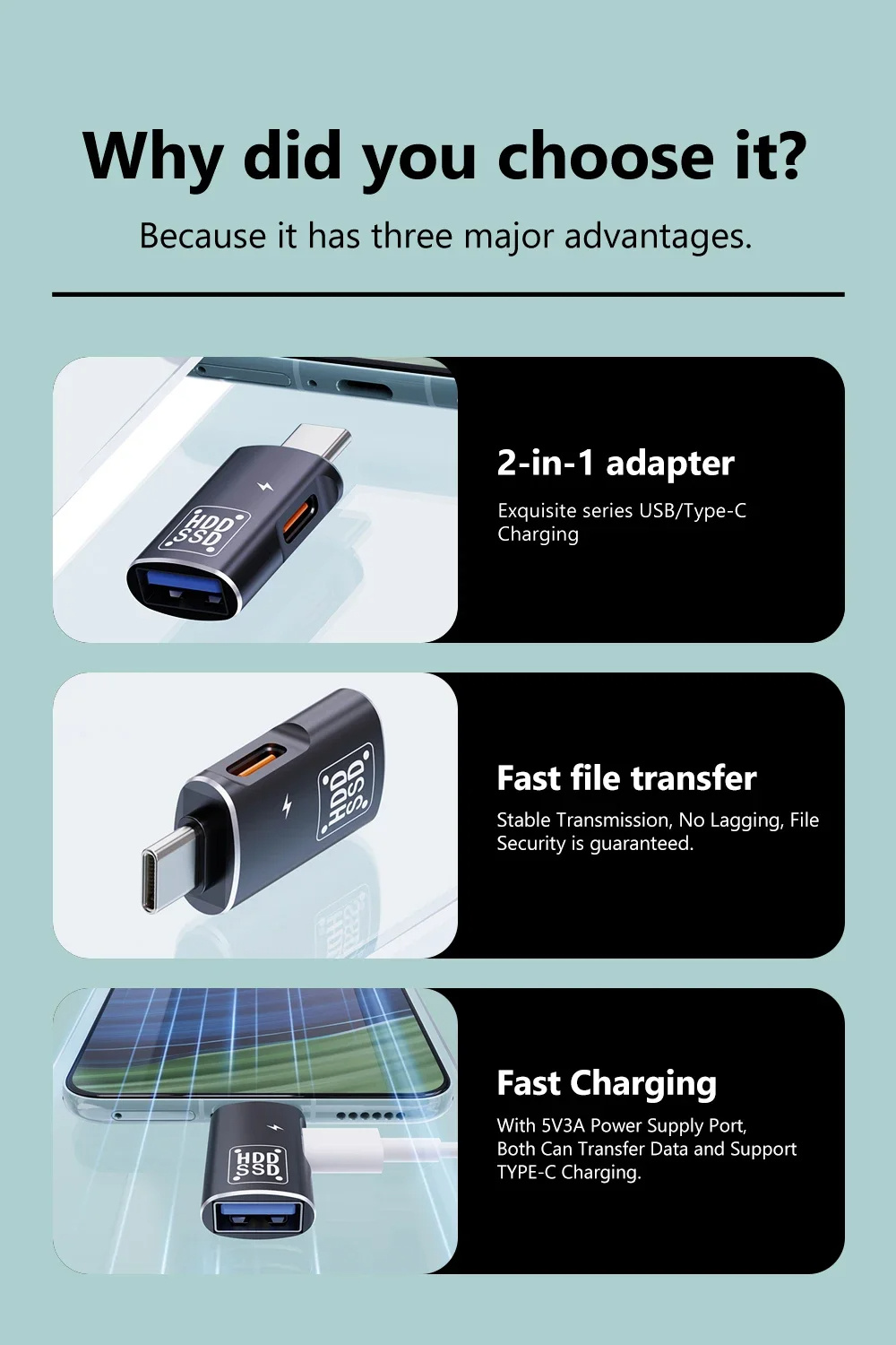 2. Compatibility: Supports various devices like Macbook, Xiaomi, Huawei, for Samsung, keyboards, printers, gamepads, flash drives, and HDD/SSD storage.
