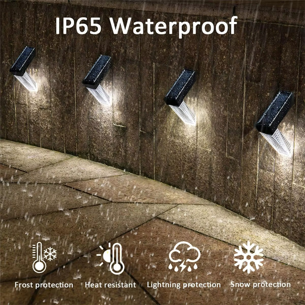 - IP65 Waterproof: The solar-powered fence lights reach IP65 waterproof which is made of premium ABS and PC material, provide excellent resistance to heat, low temperature. protecting the lamp from bad weather like rain, sleet, or snow.