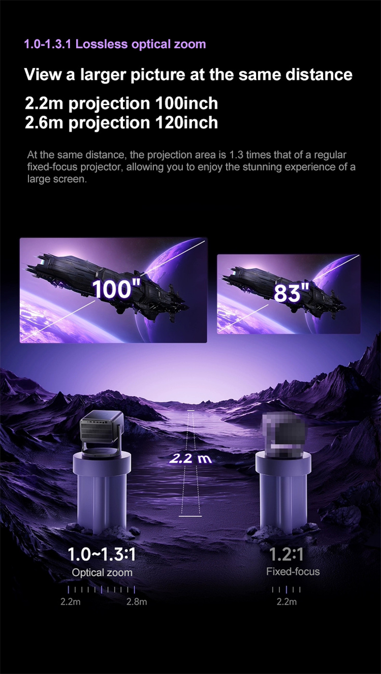 2. Lossless Optical Zoom: 1.0-1.3x zoom to project up to 120 inches at 2.6m distance.