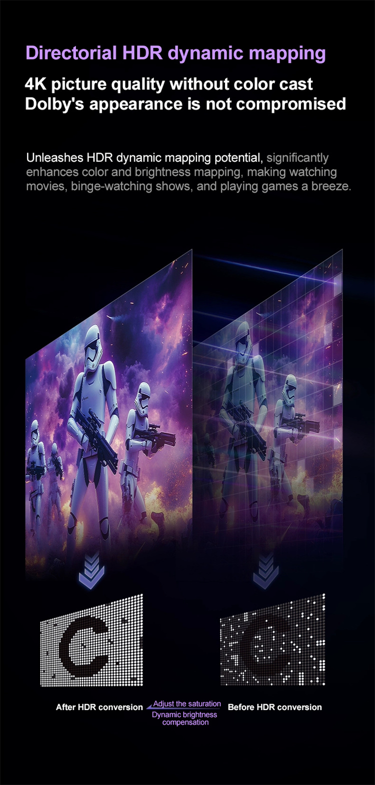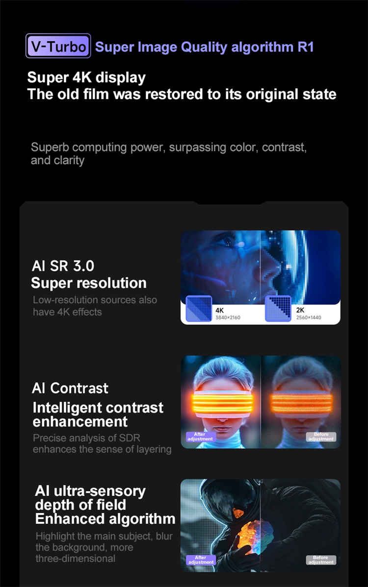 6. Super 4K Algorithm: AI-enhanced resolution upgrades ensures low-resolution content achieves 4K-like effects.