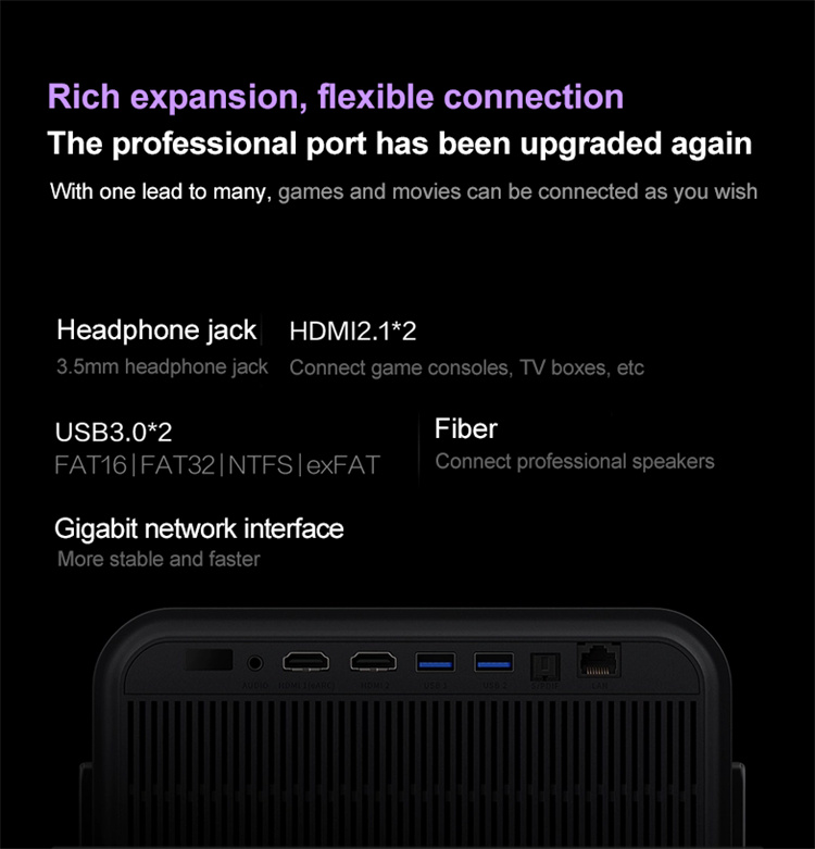 Ports: USB3.0*2, HDMI2.1*2, LAN1, Optical fiber audio*1, 3.5mm*1
