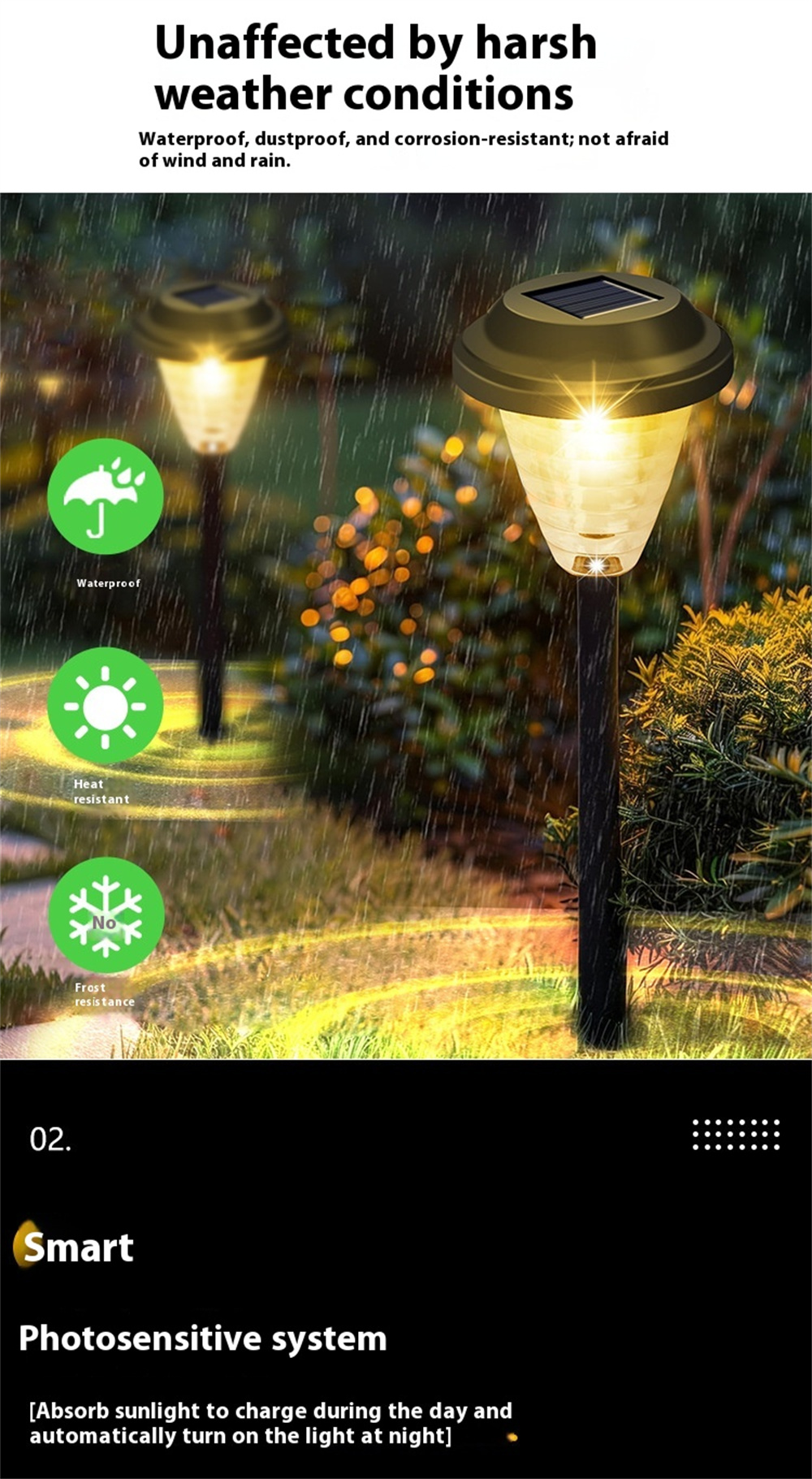 - Automatic Smart Operation: Turns on at night and off at daytime automatically. The light sensor ensures hands-free operation without manual intervention.