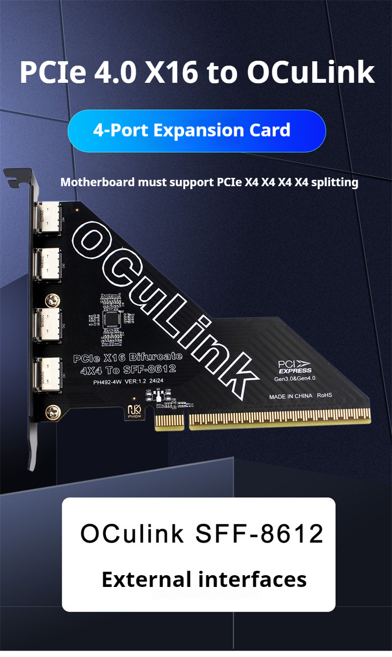 PH492-4W PCIe4 0 X16 to Oculink SFF-8612 Extension Card 4 Port Bifurcation Support for U.2 SSD External GPU High Bandwidth 64Gbps PCIe Gen4 Expansion Card