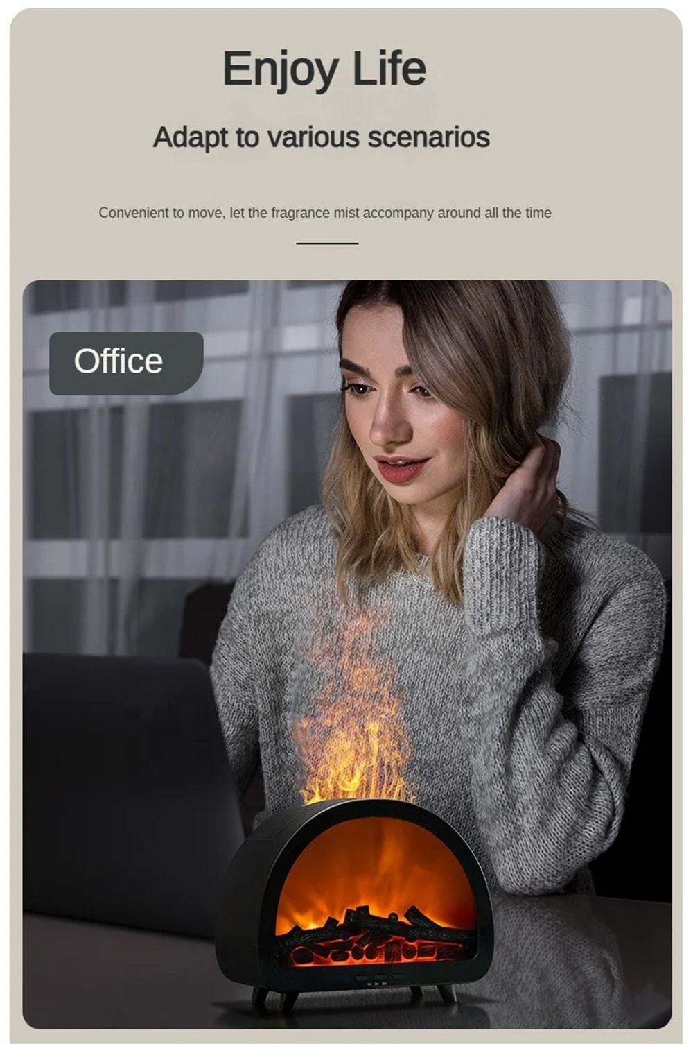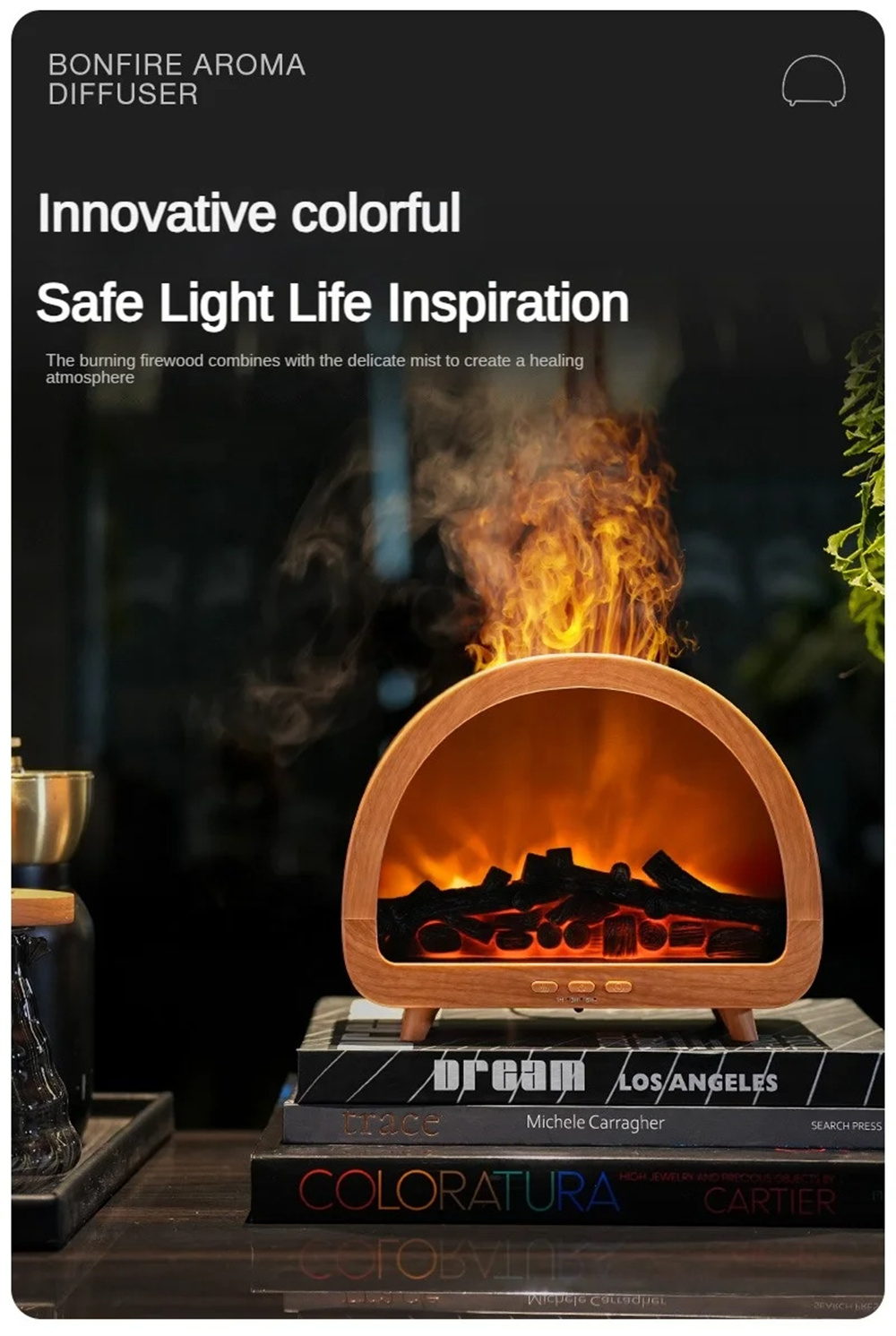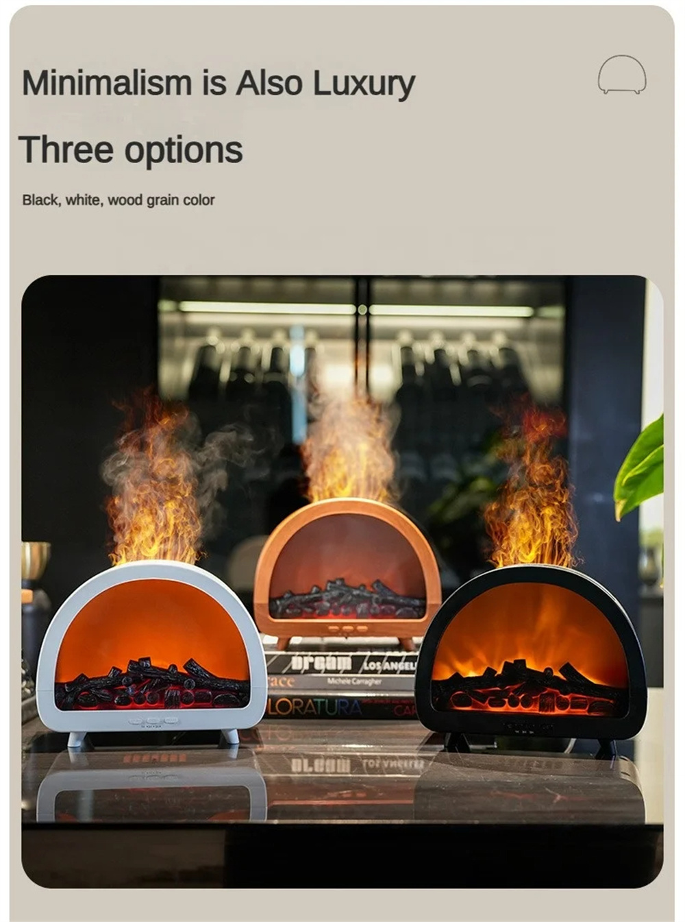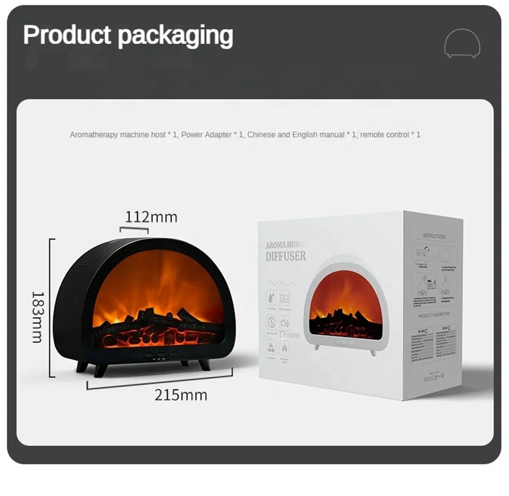 1.Realistic & Colorful Flame EffectCreate a warm, relaxing atmosphere with 12 vibrant flame colors and a lifelike projection that mimics the soothing glow of a real fire — perfect for cozy evenings.2.Aromatherapy & Deep HumidificationCombine your favorite essential oils with powerful cool mist output to purify and refresh the air, helping you unwind and breathe more comfortably.3.Smart Remote Control & TimerAdjust mist levels, light colors, or set the 3-speed timer conveniently from anywhere in the room — effortless comfort at your fingertips.4.Compact 200ML Capacity & Elegant DesignWith its minimalist European aesthetic, this diffuser fits beautifully into bedrooms, offices, or living spaces — adding both function and style.5.Whisper-Quiet OperationEnjoy uninterrupted sleep or work with ultra-silent mist diffusion that maintains calmness and relaxation throughout the day and night.6.Perfect All-in-One Wellness GiftA thoughtful, multi-functional gift that blends aromatherapy, humidification, and mood lighting — ideal for birthdays, holidays, or home décor lovers.