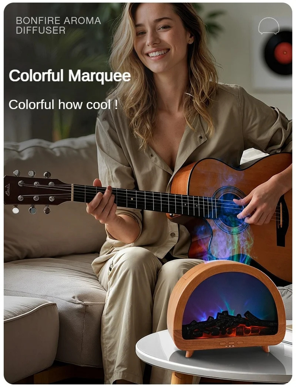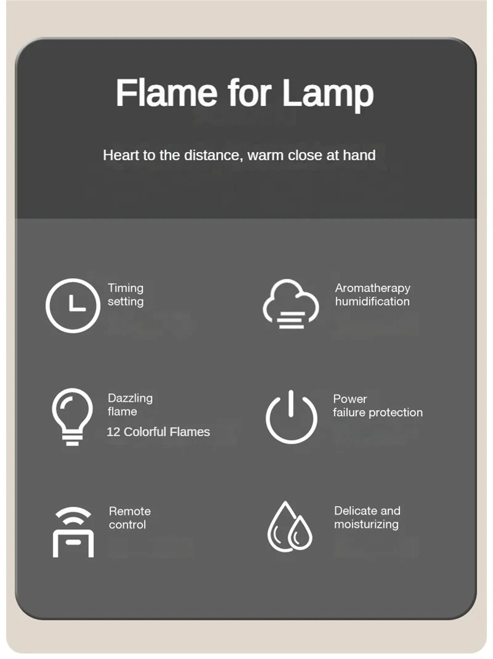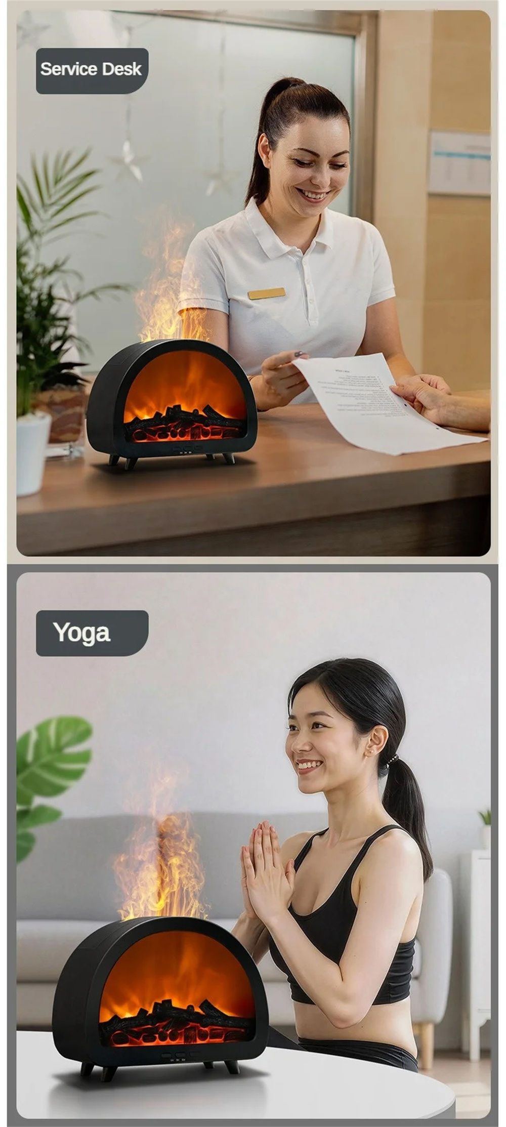 1.Realistic & Colorful Flame EffectCreate a warm, relaxing atmosphere with 12 vibrant flame colors and a lifelike projection that mimics the soothing glow of a real fire — perfect for cozy evenings.2.Aromatherapy & Deep HumidificationCombine your favorite essential oils with powerful cool mist output to purify and refresh the air, helping you unwind and breathe more comfortably.3.Smart Remote Control & TimerAdjust mist levels, light colors, or set the 3-speed timer conveniently from anywhere in the room — effortless comfort at your fingertips.4.Compact 200ML Capacity & Elegant DesignWith its minimalist European aesthetic, this diffuser fits beautifully into bedrooms, offices, or living spaces — adding both function and style.5.Whisper-Quiet OperationEnjoy uninterrupted sleep or work with ultra-silent mist diffusion that maintains calmness and relaxation throughout the day and night.6.Perfect All-in-One Wellness GiftA thoughtful, multi-functional gift that blends aromatherapy, humidification, and mood lighting — ideal for birthdays, holidays, or home décor lovers.
