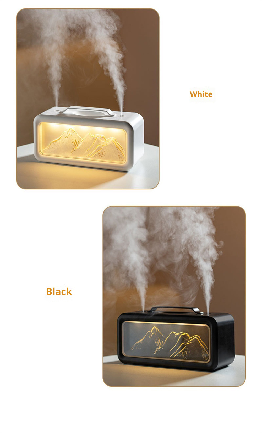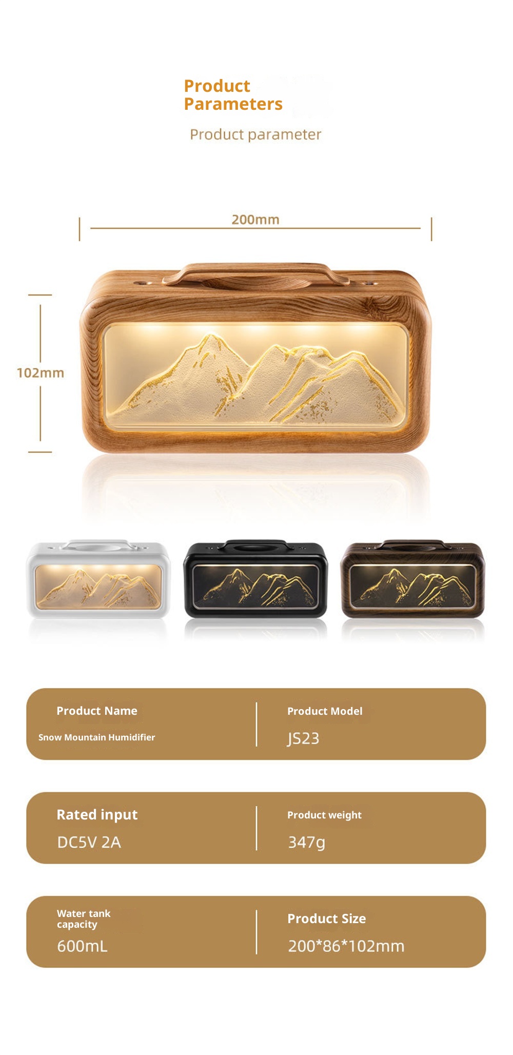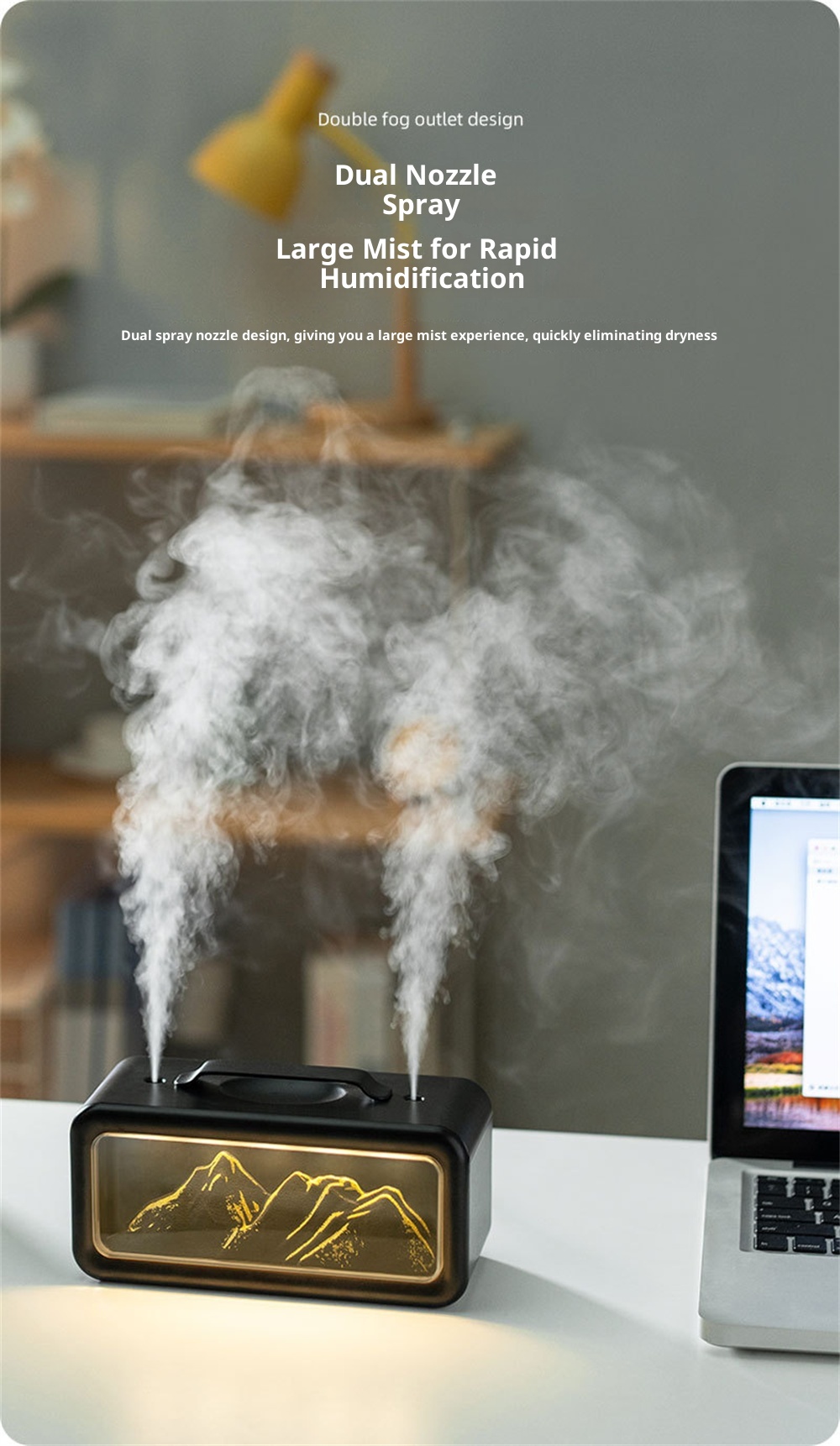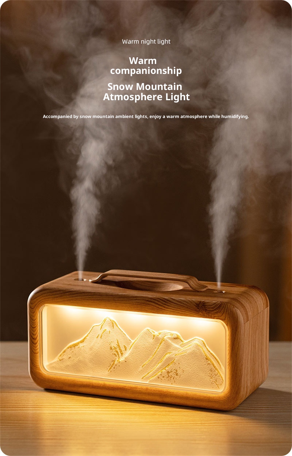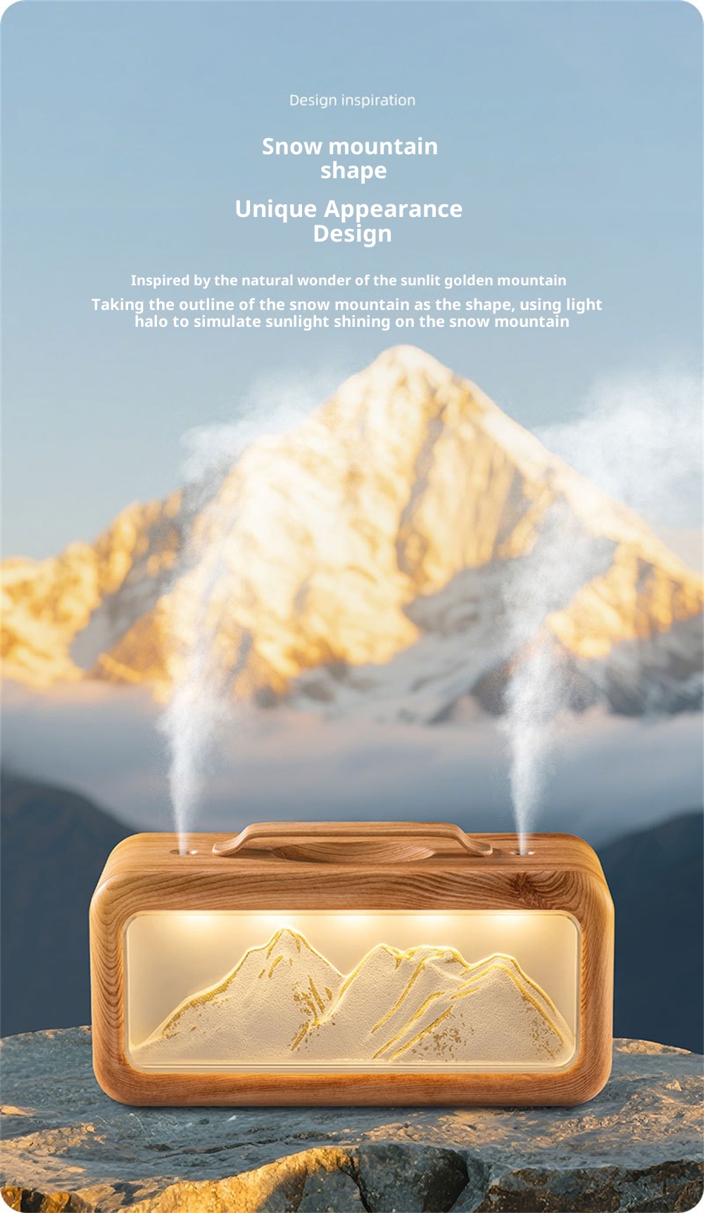 1.Unique Snow Mountain AestheticEnjoy a touch of nature-inspired elegance with its modern Modern Glacier Design, perfectly suited for contemporary home or office decor.2.High-Efficiency 600mL CapacityFeatures a large-volume water tank for extended operation, providing long-lasting humidification without frequent refills.3.Adjustable Dual Fog Modes & Triple LightingCustomize your comfort with two mist output levels and three soft lighting options to create the ideal ambiance day or night.4.Quiet & Powerful Ultrasonic OperationEnjoy whisper-quiet humidification with advanced ultrasonic technology that delivers a steady mist while maintaining a peaceful environment.5.USB Powered for Convenient Use Anywhere