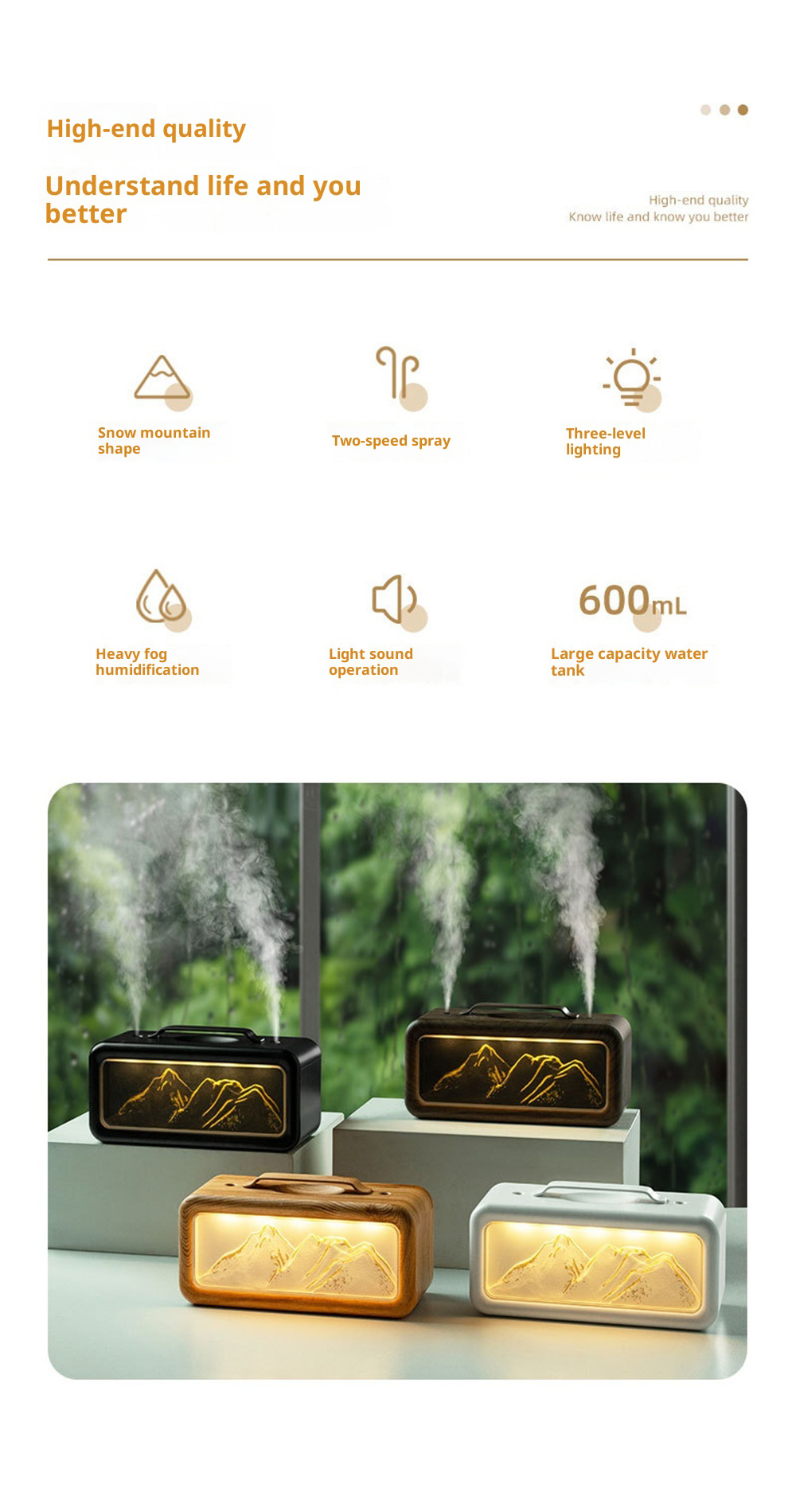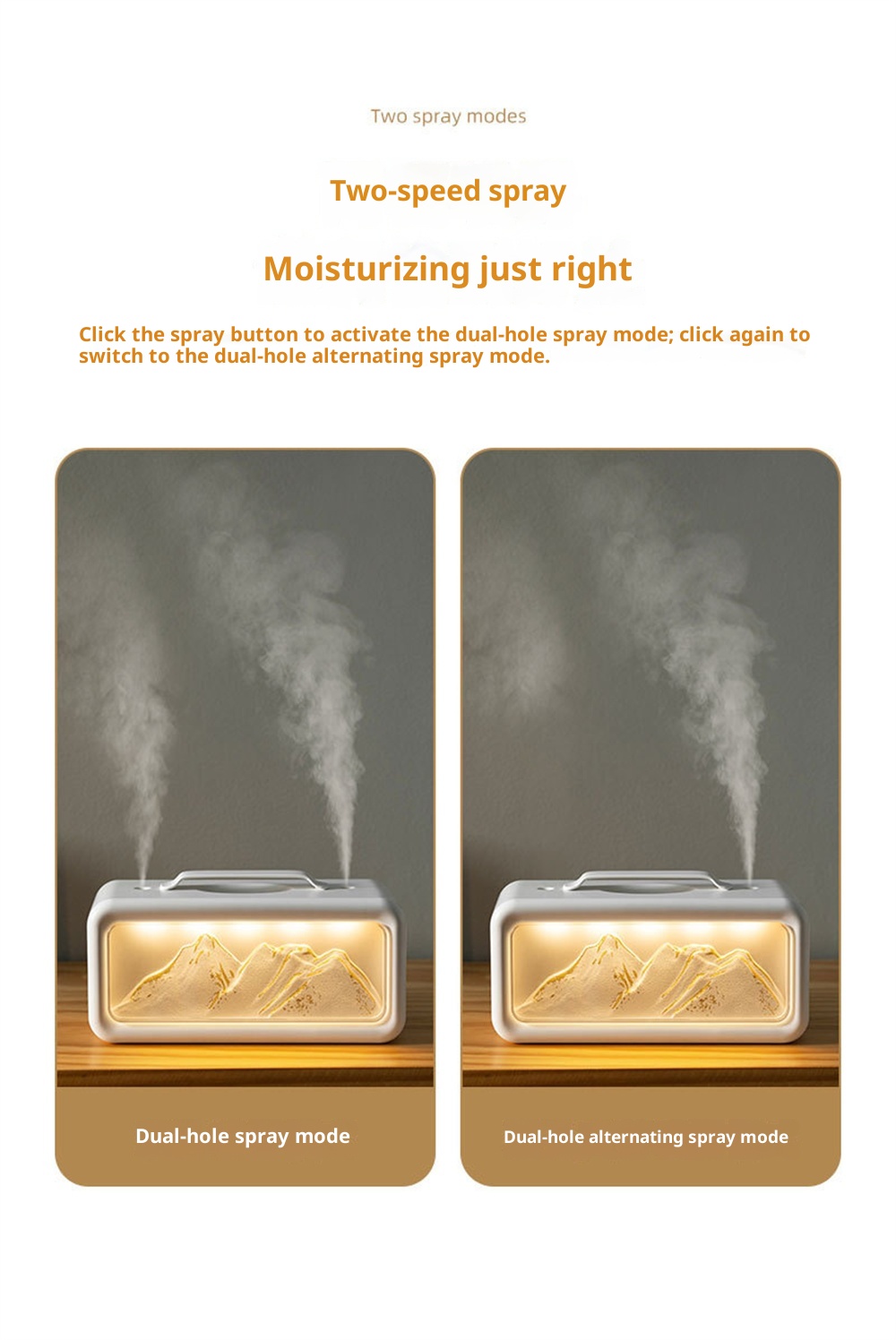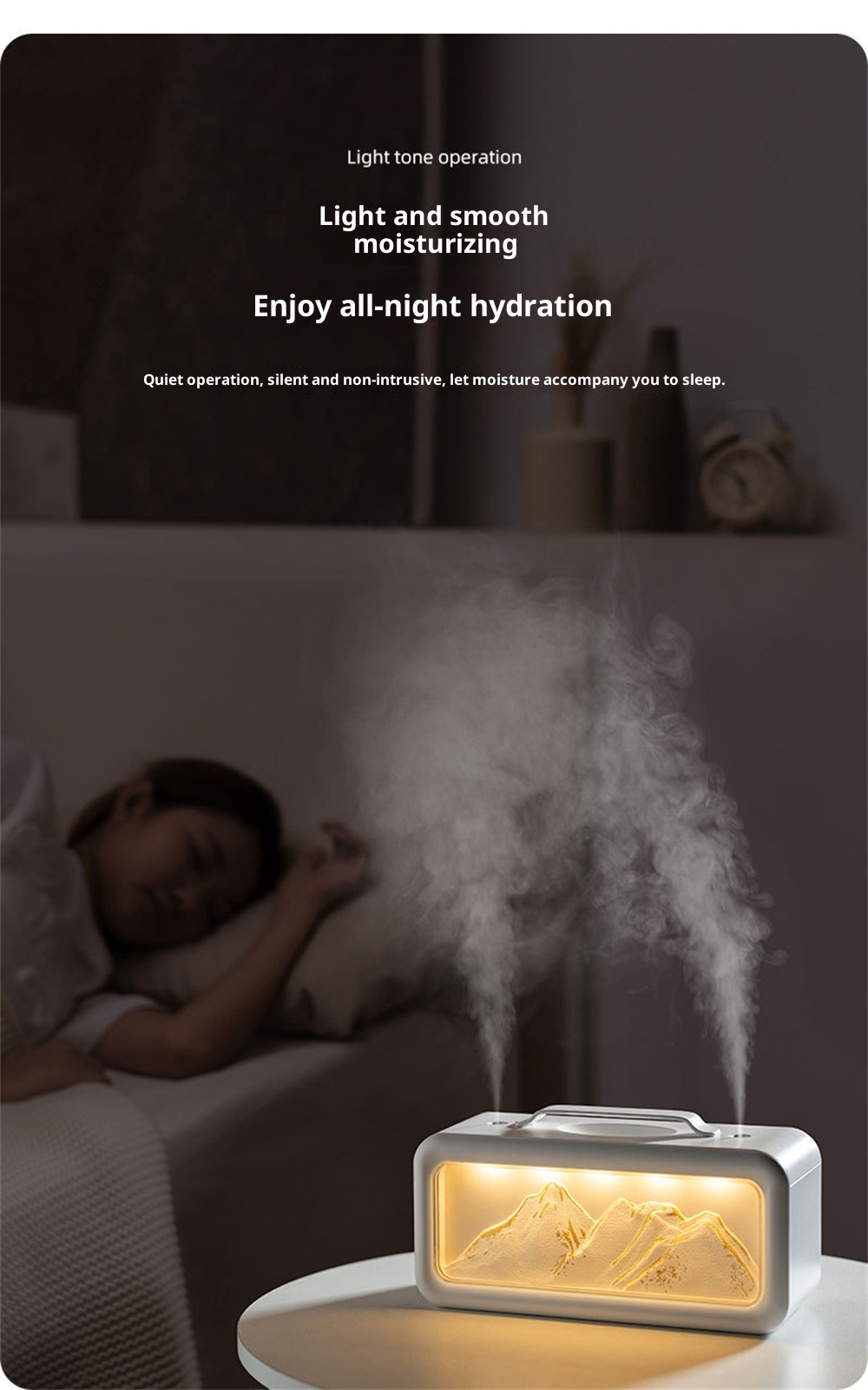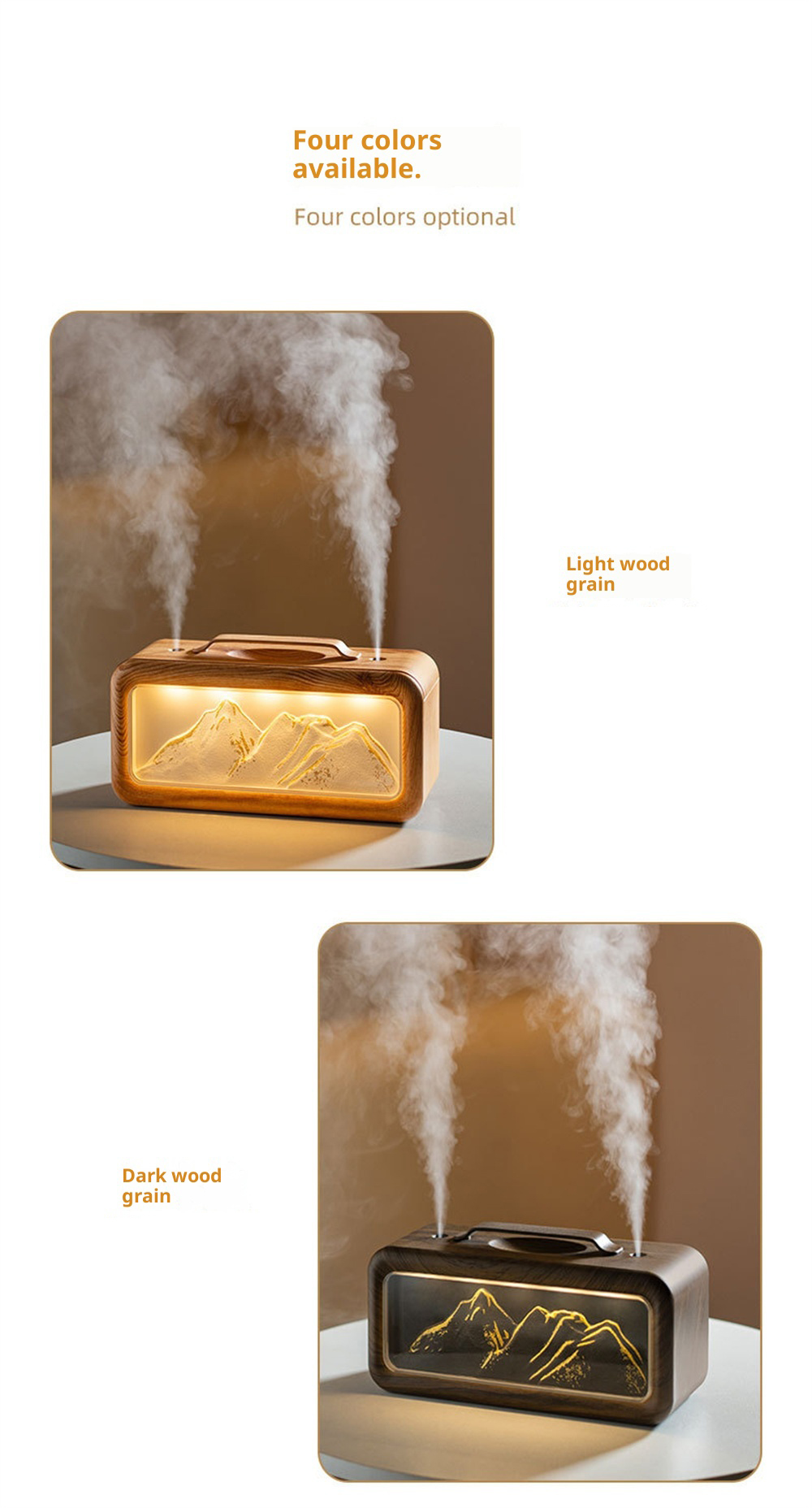1.Unique Snow Mountain AestheticEnjoy a touch of nature-inspired elegance with its modern Modern Glacier Design, perfectly suited for contemporary home or office decor.2.High-Efficiency 600mL CapacityFeatures a large-volume water tank for extended operation, providing long-lasting humidification without frequent refills.3.Adjustable Dual Fog Modes & Triple LightingCustomize your comfort with two mist output levels and three soft lighting options to create the ideal ambiance day or night.4.Quiet & Powerful Ultrasonic OperationEnjoy whisper-quiet humidification with advanced ultrasonic technology that delivers a steady mist while maintaining a peaceful environment.5.USB Powered for Convenient Use Anywhere