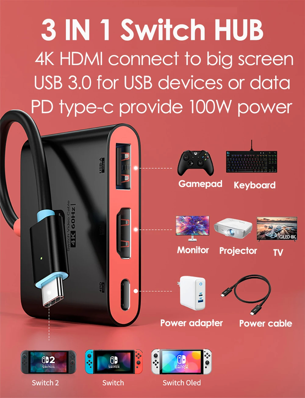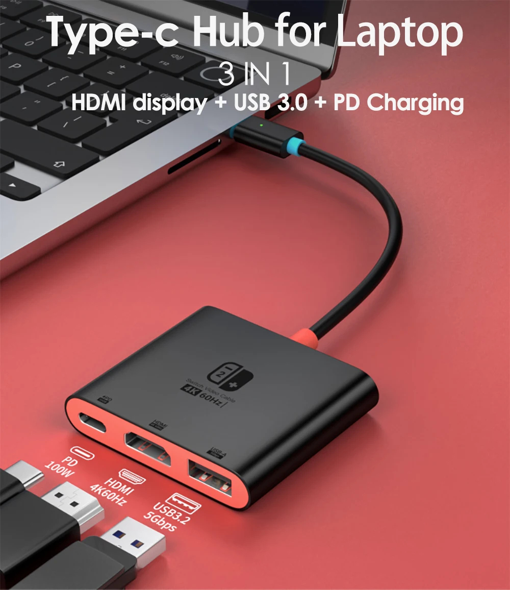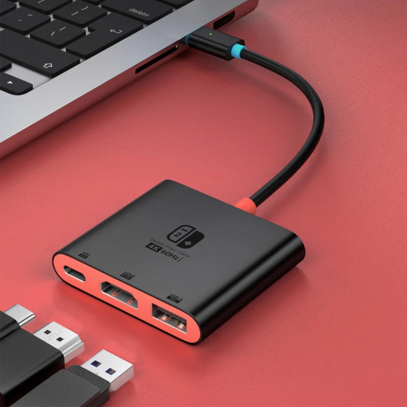 Switch2 3-in-1 Type-C Docking Station with 4K60Hz HD / PD100W / 5Gbps USB3.0 Multiports Hub Adapter Converter for TV Monitor Projector Switch Keyboard