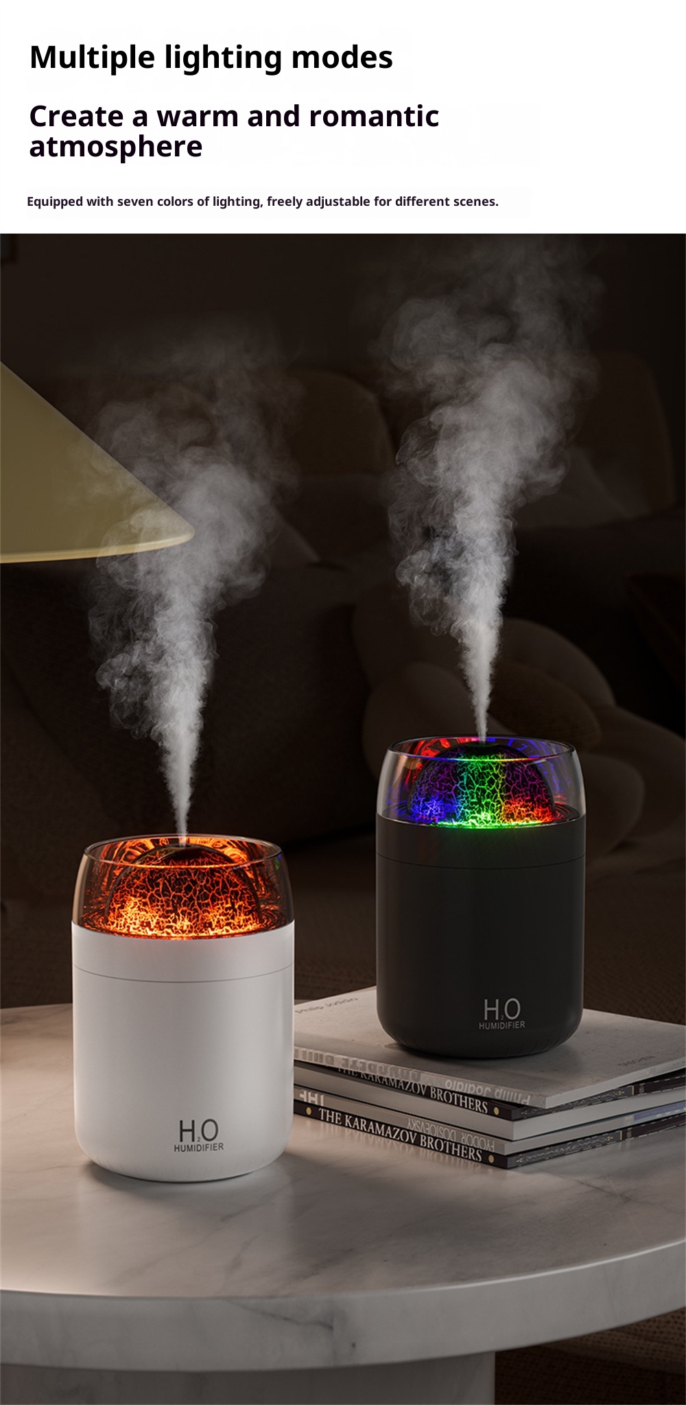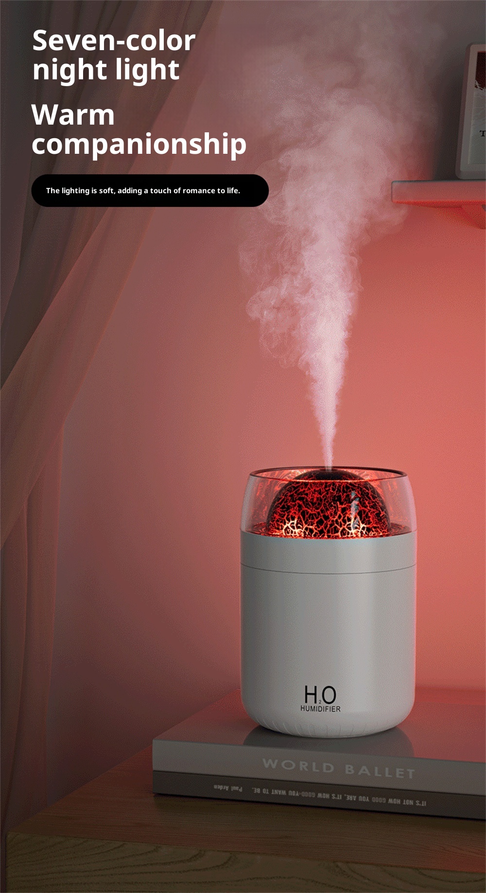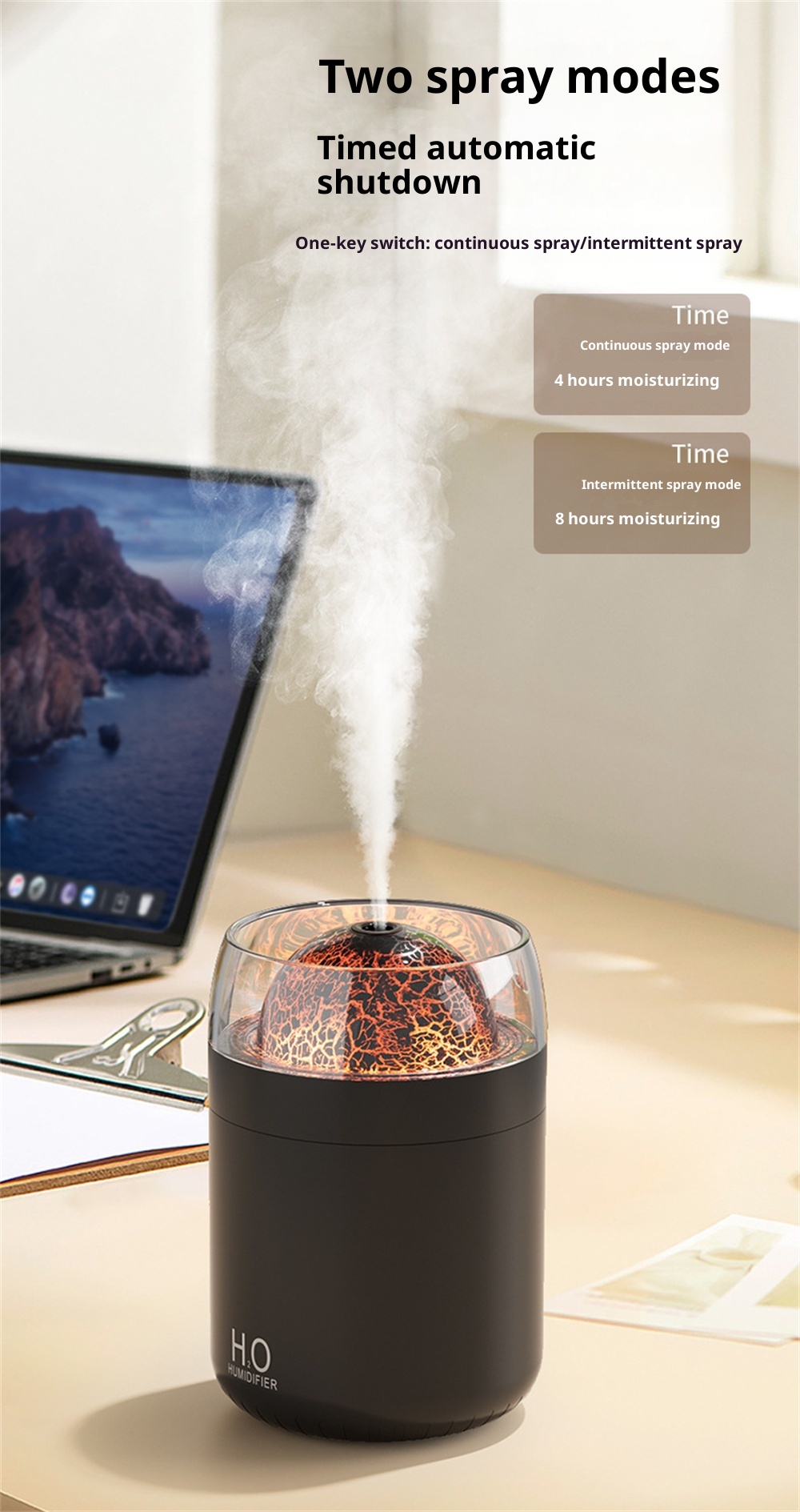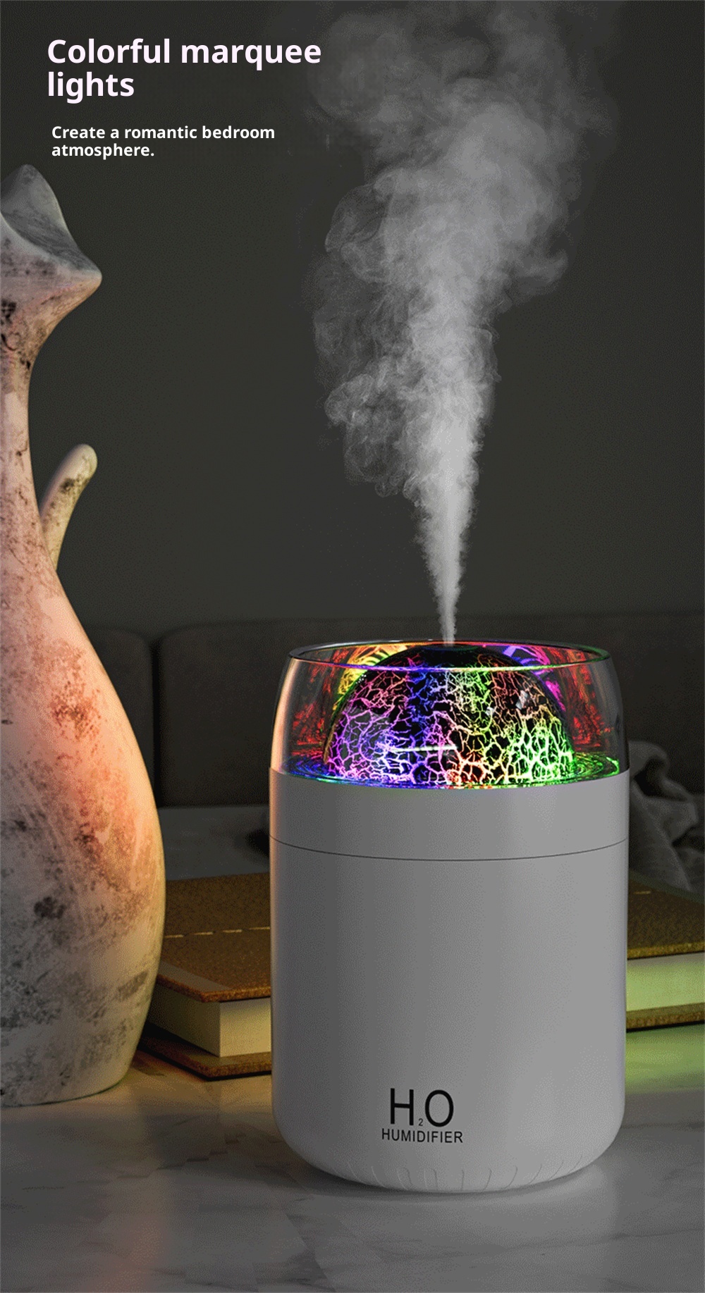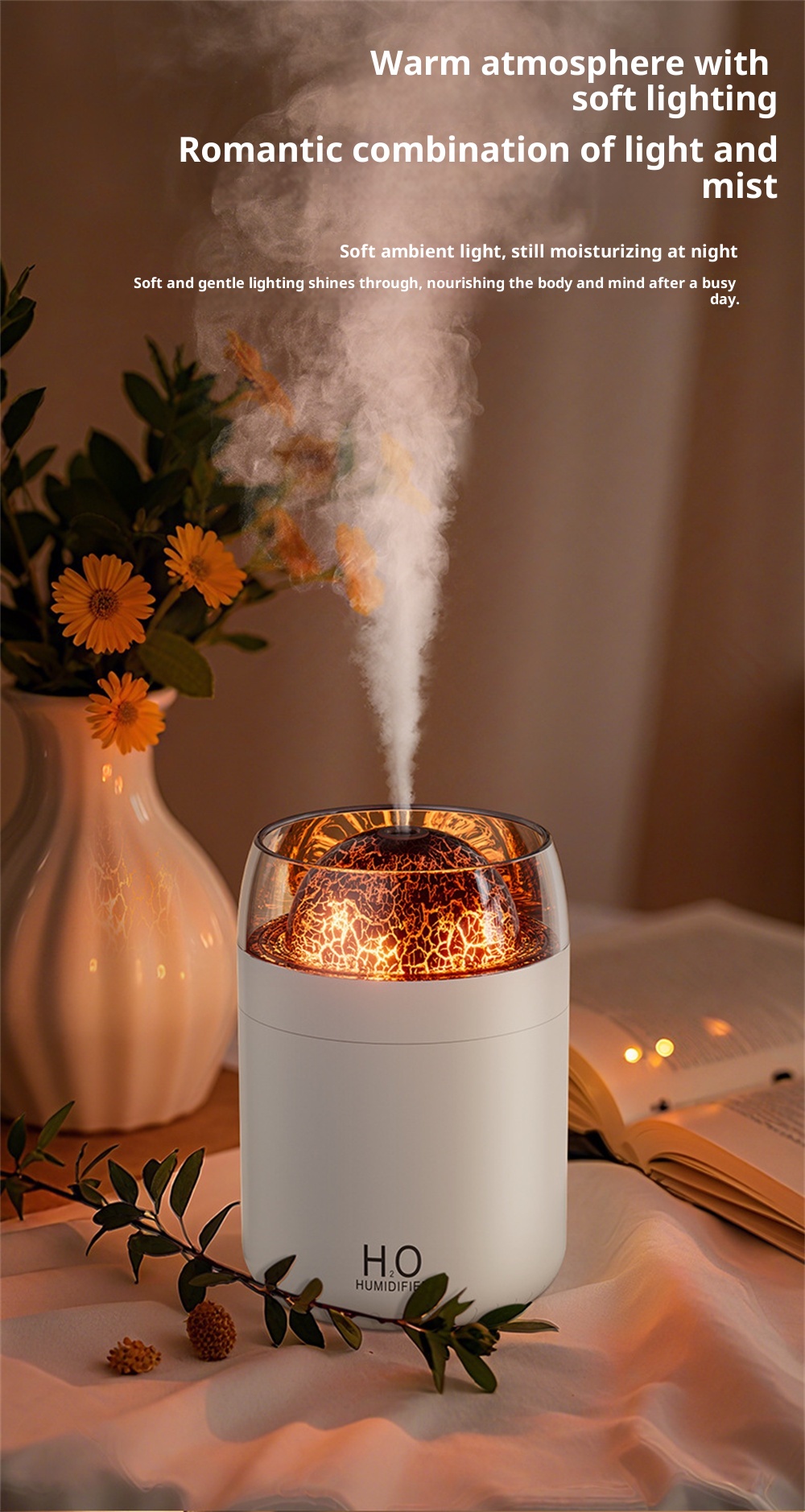 3.Night Light Feature: Equipped with an ambient night light, it creates a calming environment, it fits for nighttime use or creating a relaxing atmosphere in any space.