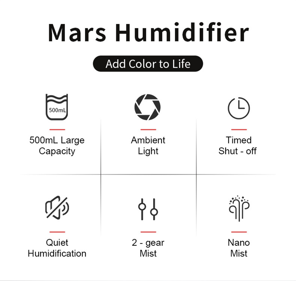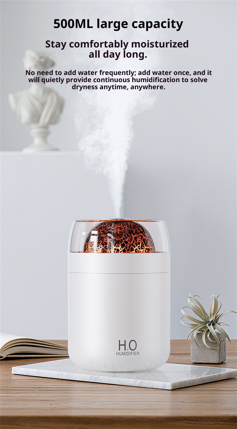 1.Large Capacity: The 500ml USB Humidifier boasts a generous water tank, allowing for extended use without the need for frequent refills, making it perfect for bedrooms, offices, and travel.