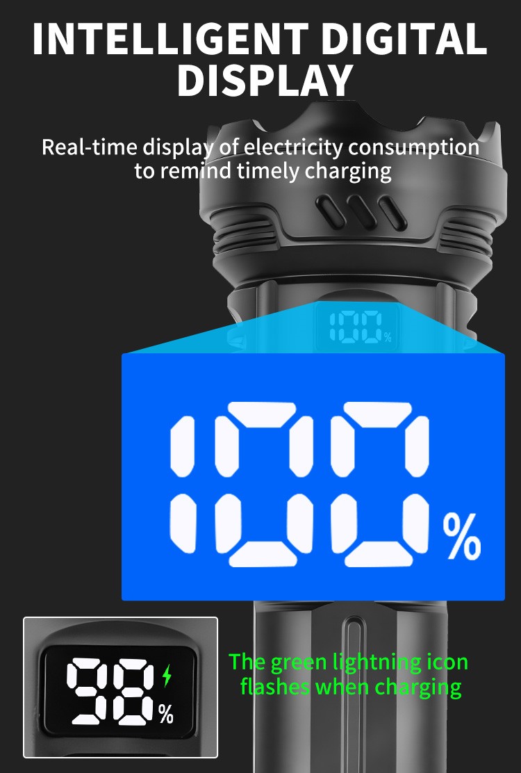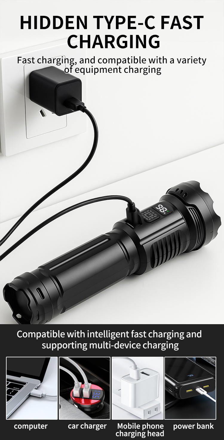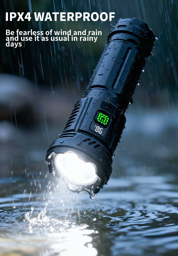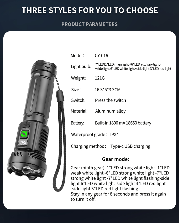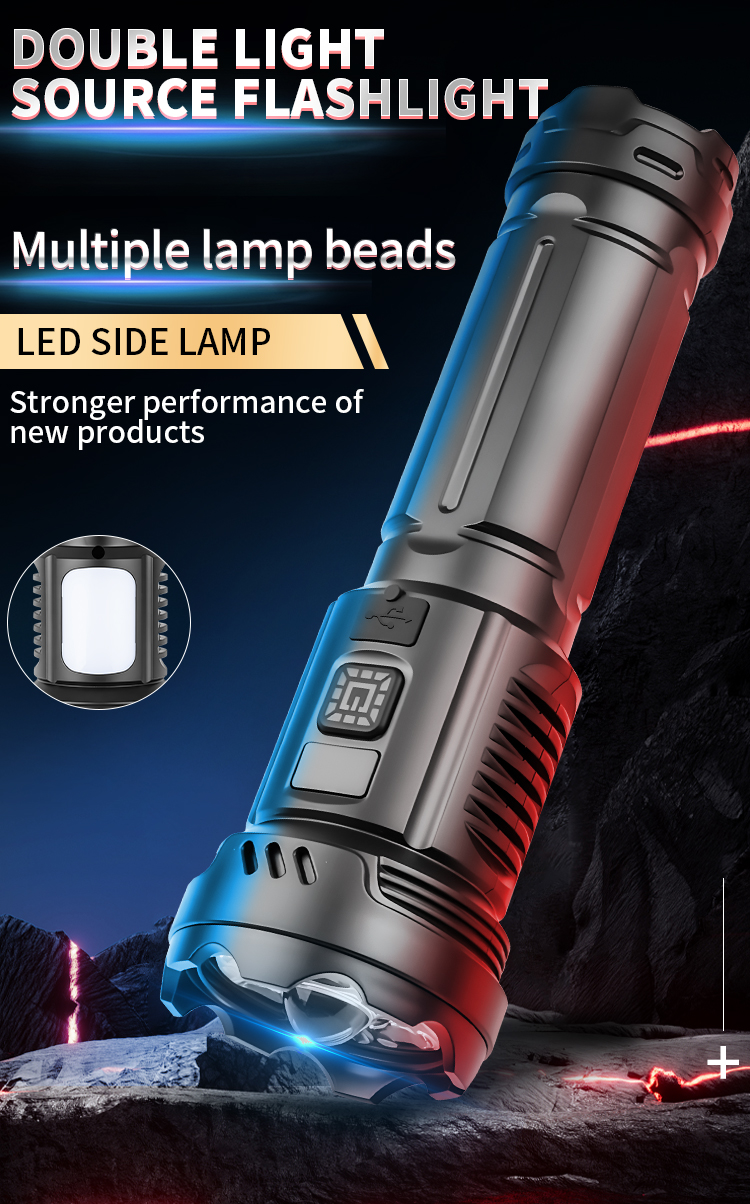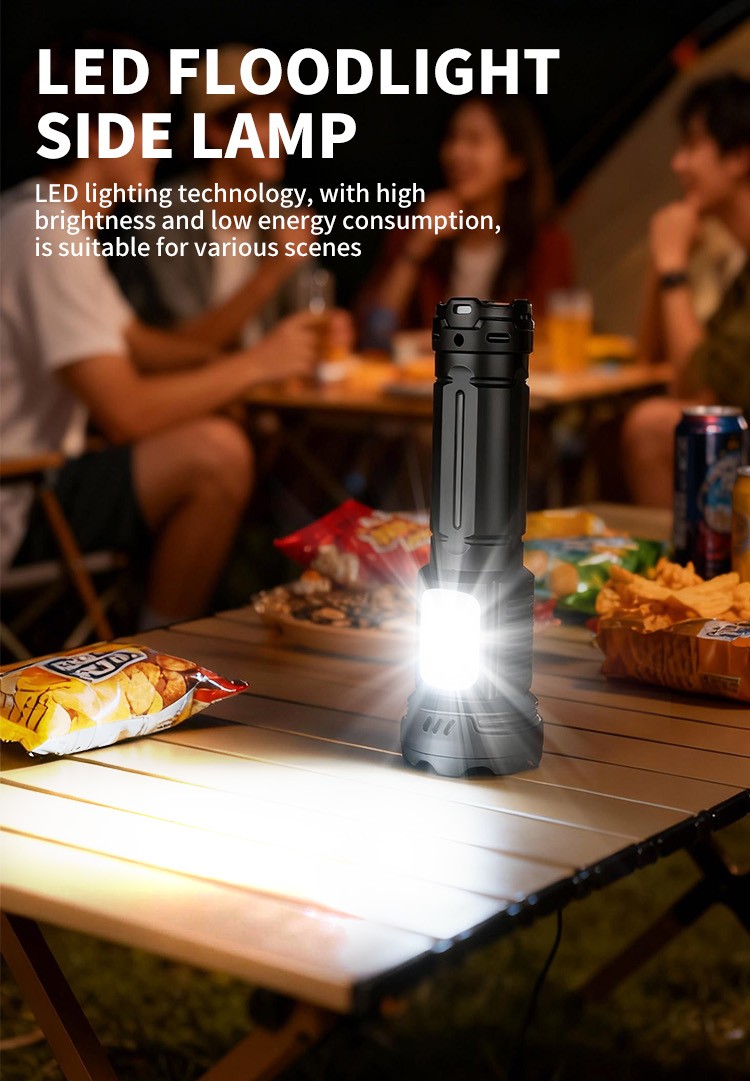 CY-016 Outdoors Digital Display Strong Flashlight with Side Lamp Versatile Light Output Type-C Rechargeable IPX4 Waterproof for Outdoor Emergency
